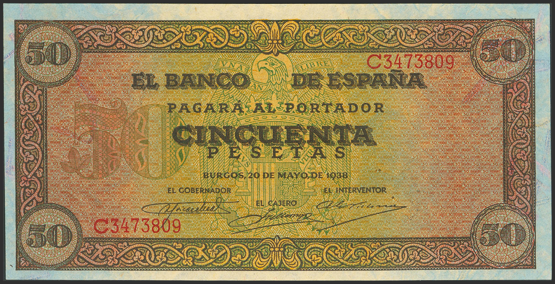 50 Pesetas. 20 de Mayo de 1938. Serie C. (Edifil 2023: 431a). Apresto original. EBC+++.