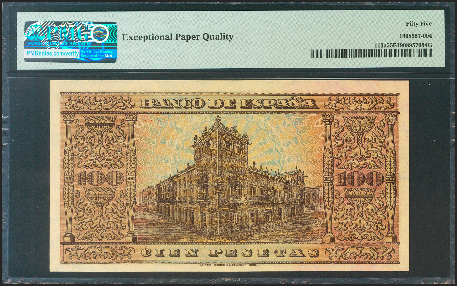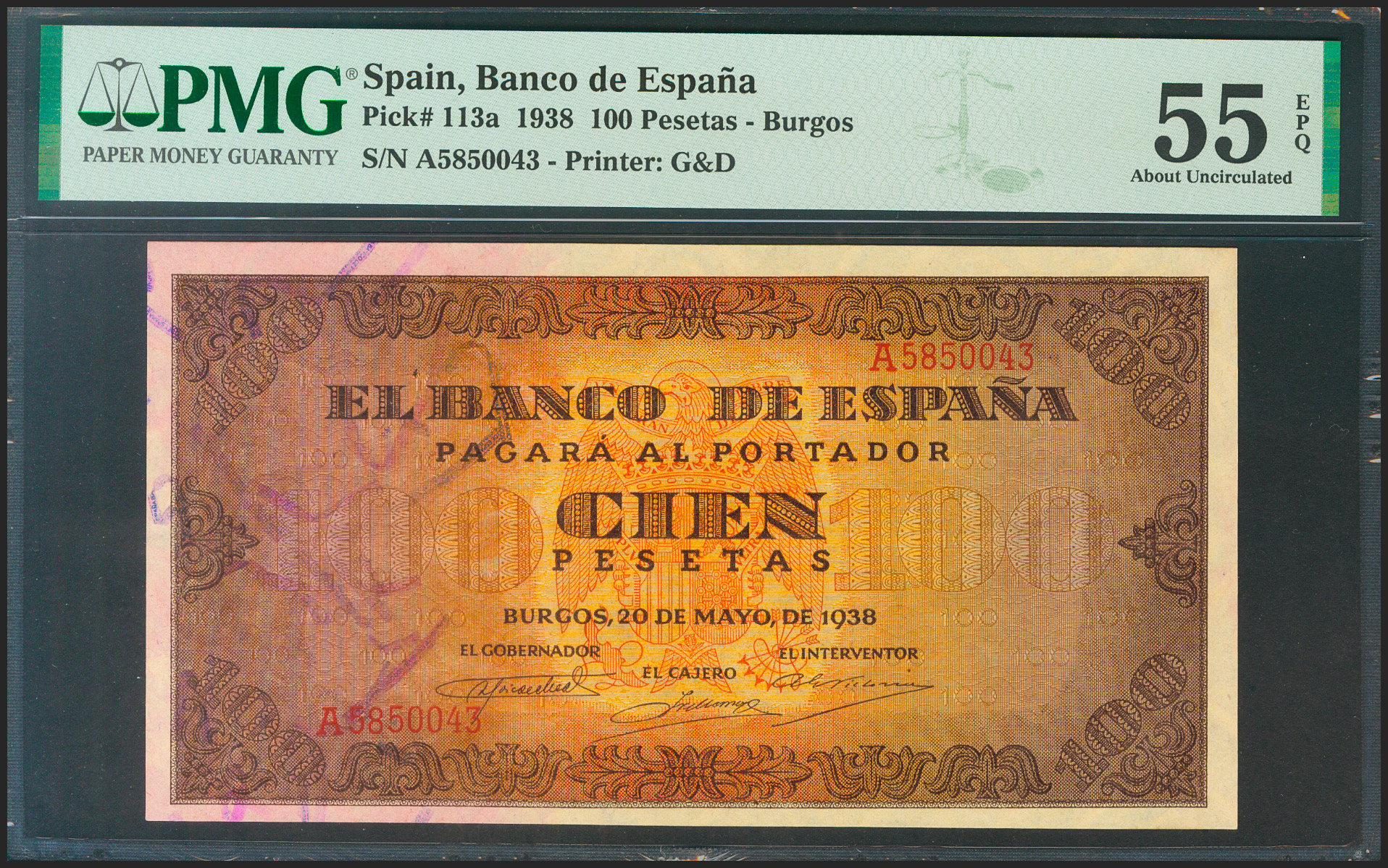 100 Pesetas. 20 de Mayo de 1938. Serie A. (Edifil 2021: 432, Pick: 113a). Apresto original. EBC+. Encapsulado PMG55EPQ.