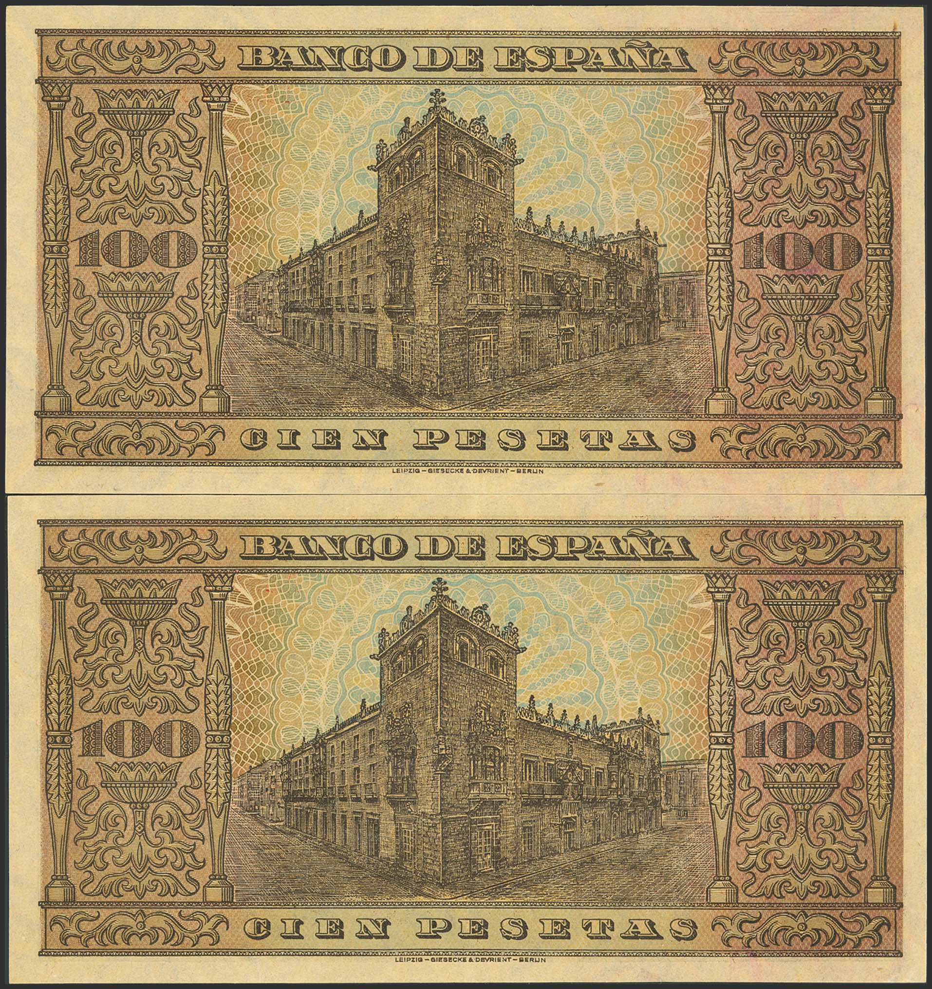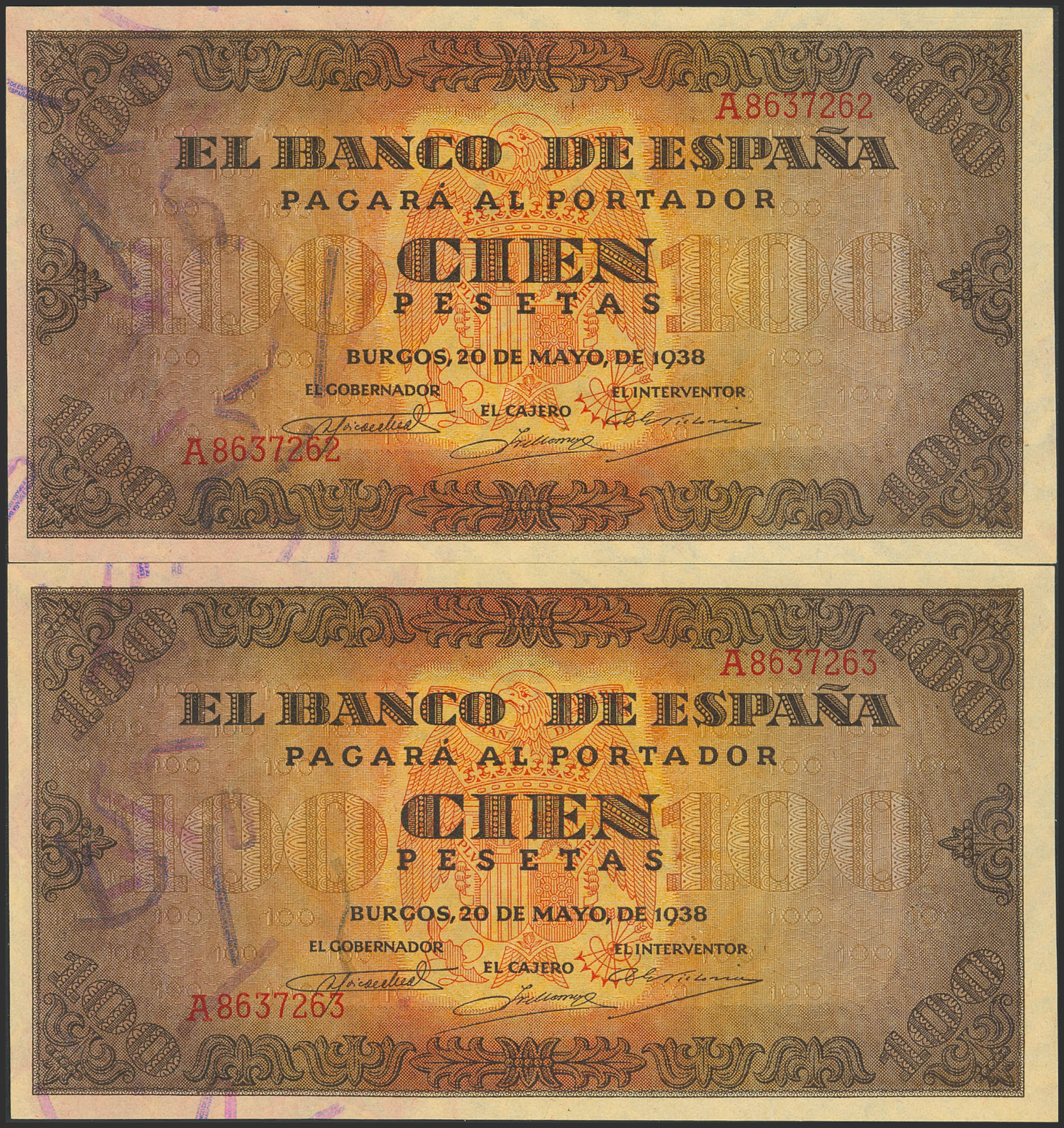 100 Pesetas. 20 de Mayo de 1938. Pareja correlativa. Serie A. (Edifil 2023: 432). Apresto original. SC.