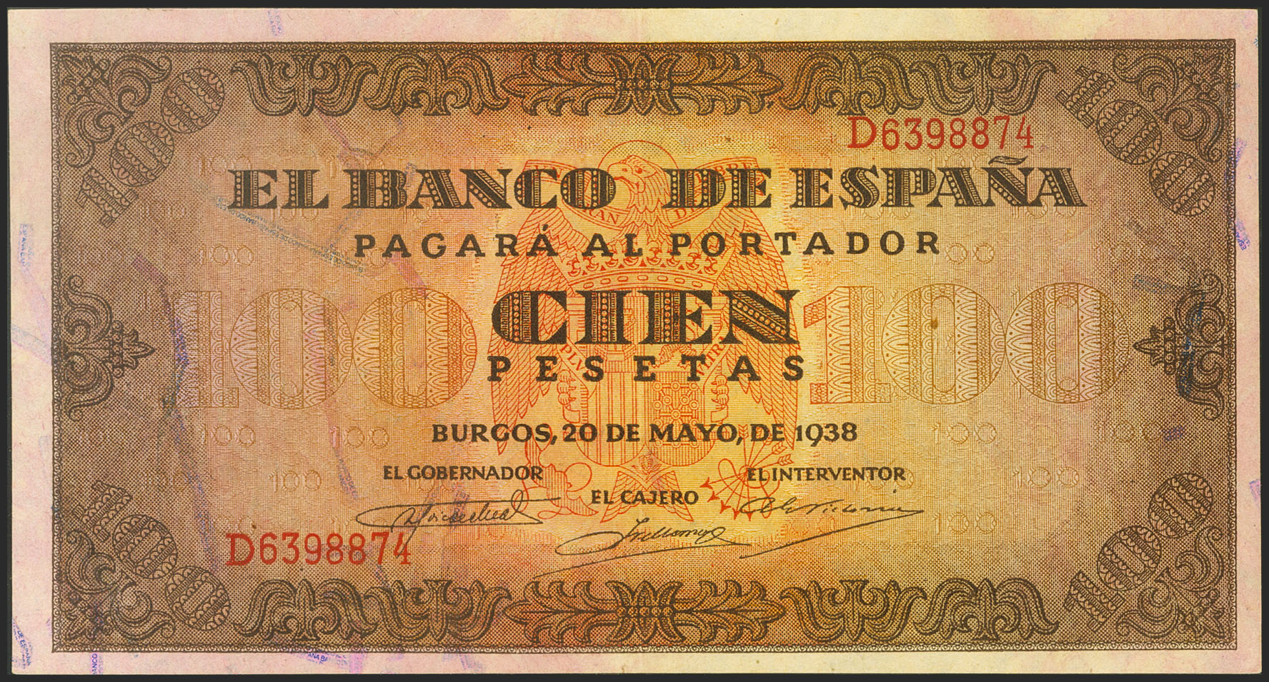 100 Pesetas. 20 de Mayo de 1938. Serie D. (Edifil 2021: 432a). Conserva gran parte de su apresto original. EBC+.