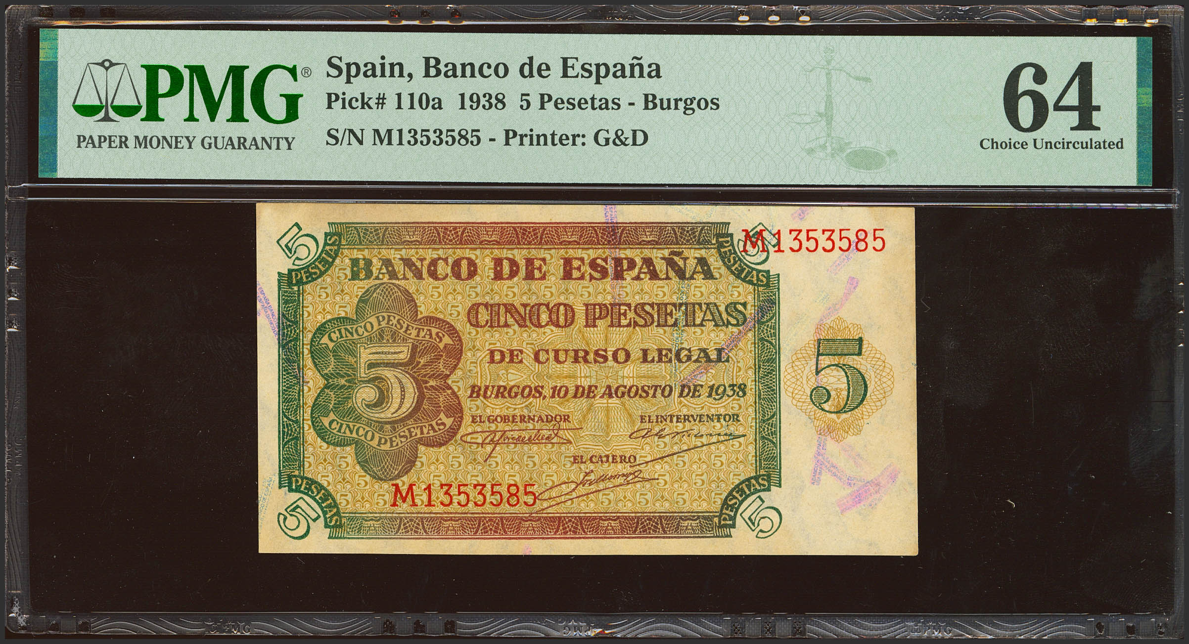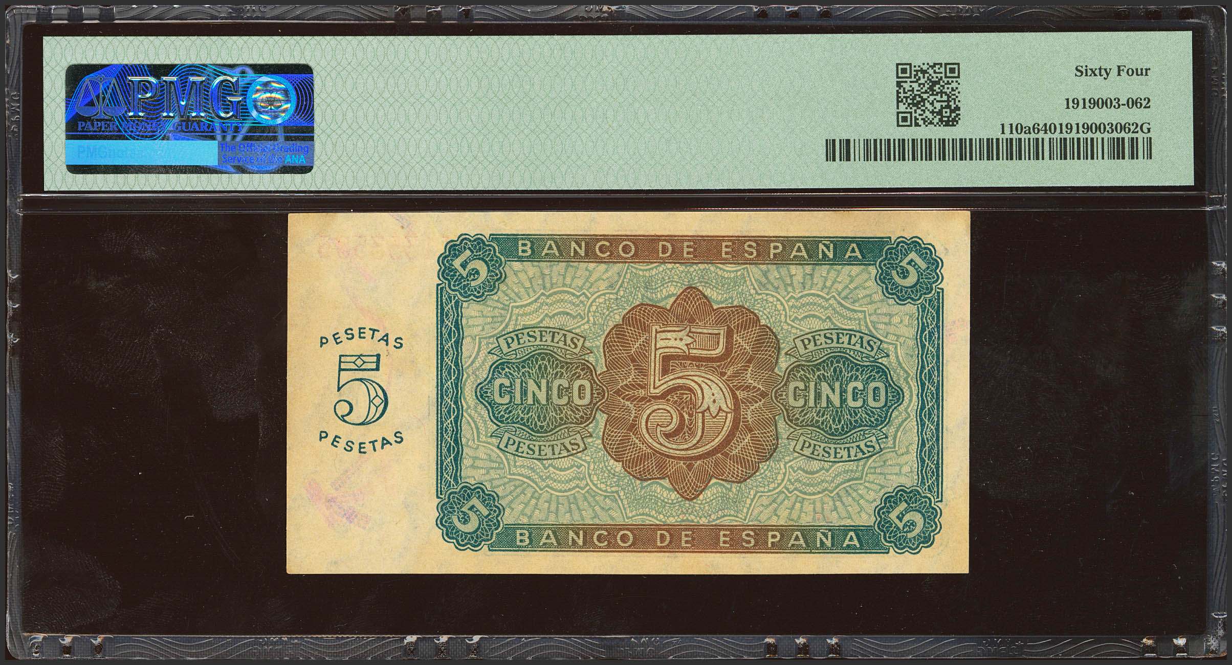 5 Pesetas. 10 de Agosto de 1938. Serie M, última serie emitida. (Edifil 2023: 435b, Pick: 110a). Rarísima serie. SC. Encapsulado PMG64.
