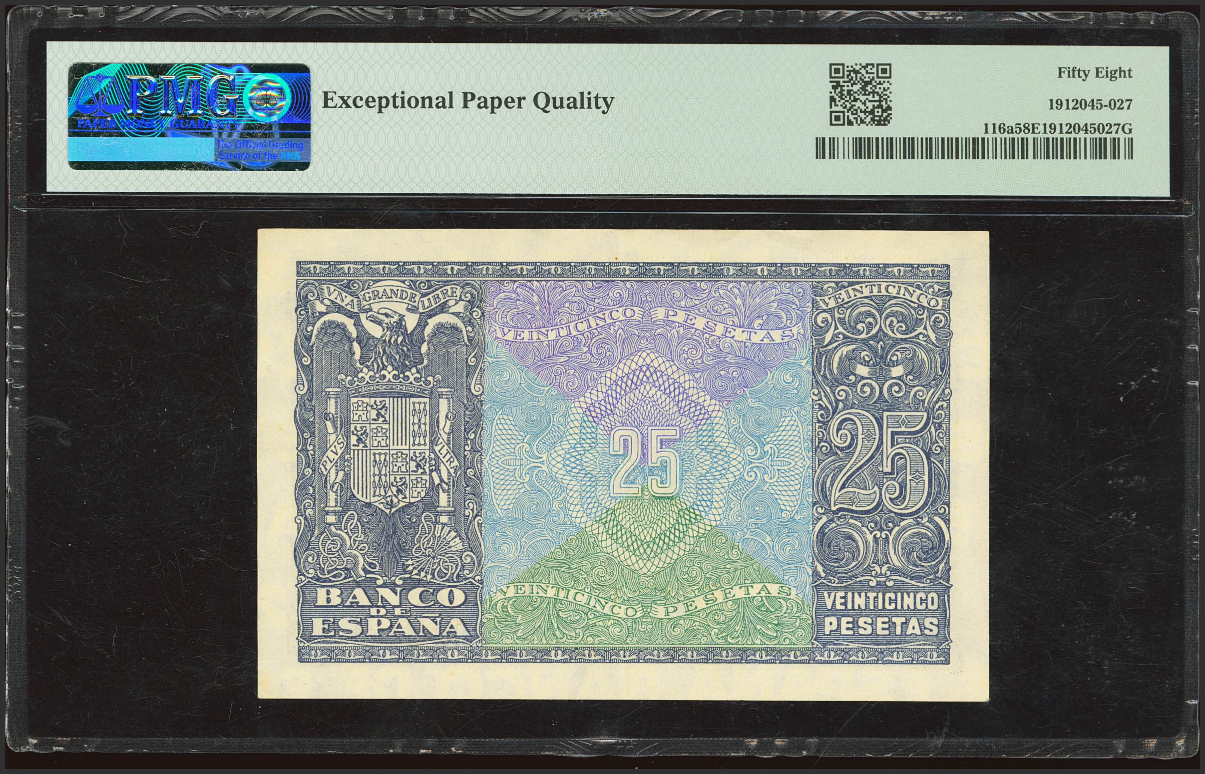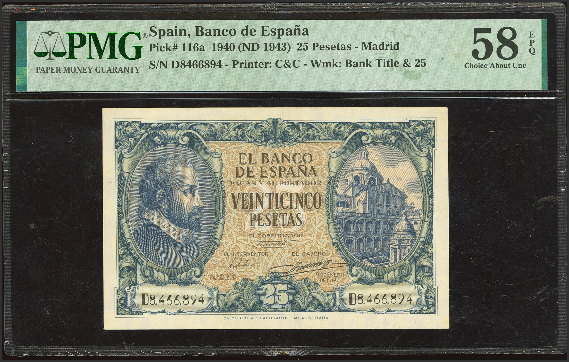 25 Pesetas. 9 de Enero de 1940. Serie D. (Edifil 2023: 436a, Pick: 116a). Apresto original. EBC+++. Encapsulado PMG58EPQ.