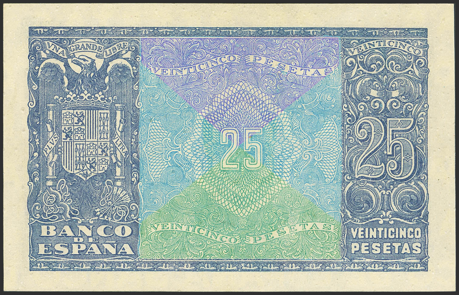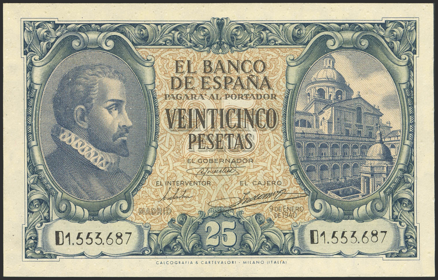 25 Pesetas. 9 de Enero de 1940. Serie D. (Edifil 2023: 436a). Toda la superficie del billete presenta puntitos en relieve. EBC. A EXAMINAR.
