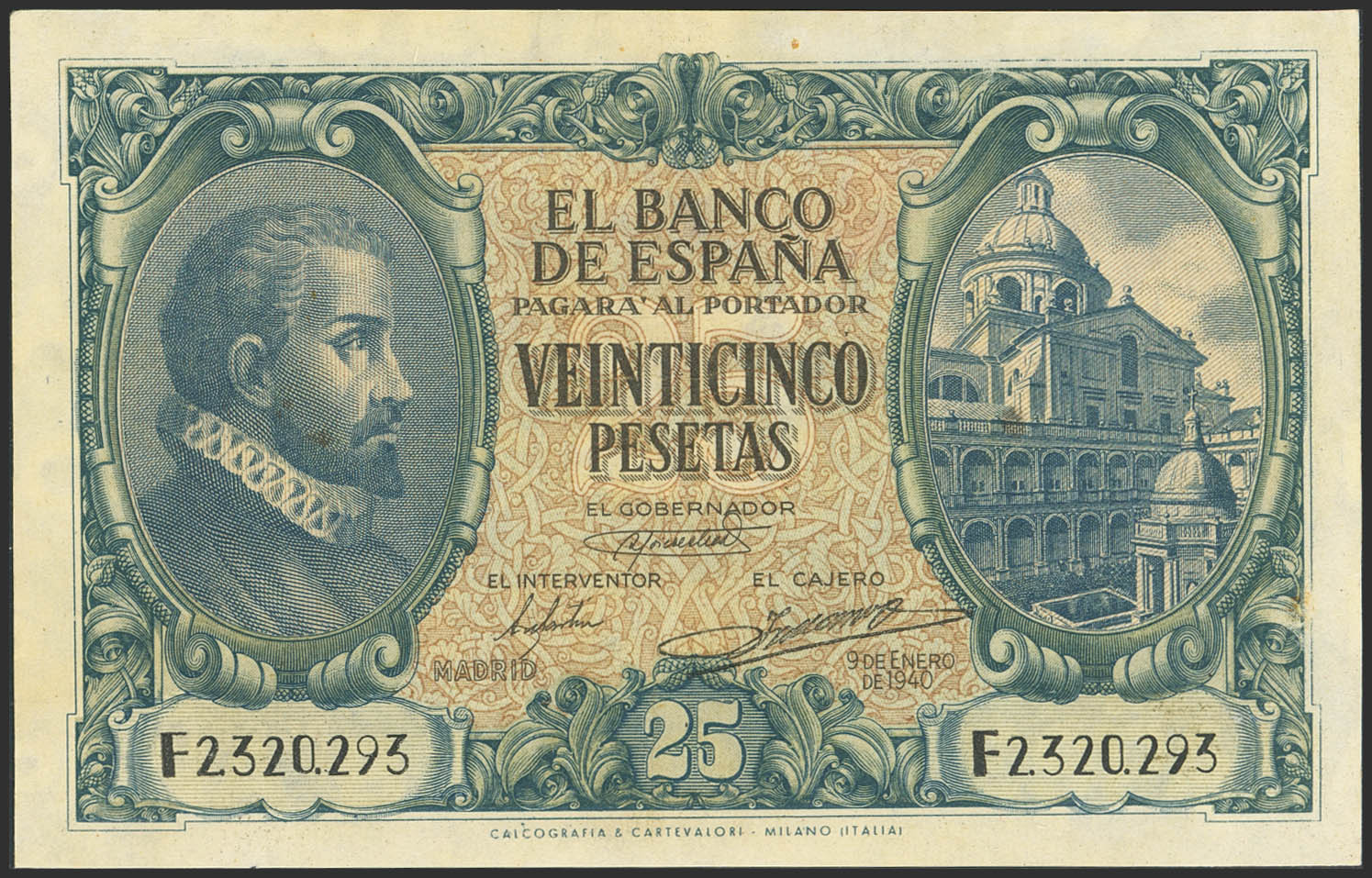 25 Pesetas. 9 de Enero de 1940. Serie F, última serie emitida. (Edifil 2023: 436b). Conserva gran parte de su apresto original. EBC+.