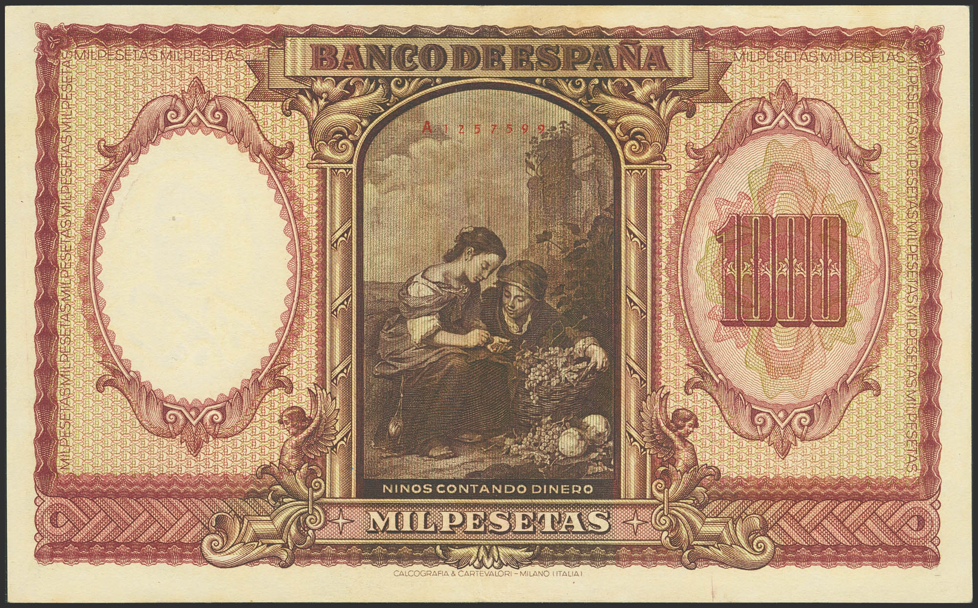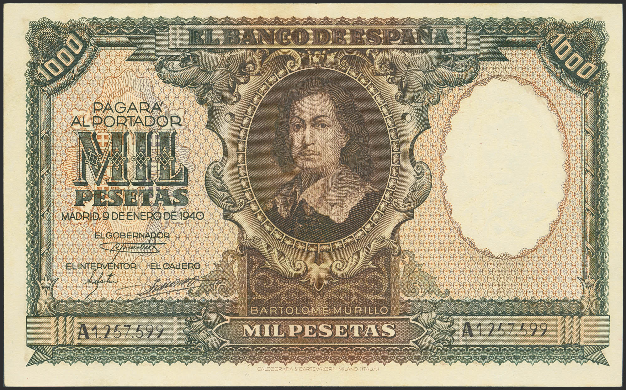 1000 Pesetas. 9 de Enero de 1940. Serie A. (Edifil 2023: 440). Conserva parte de su apresto original. EBC.