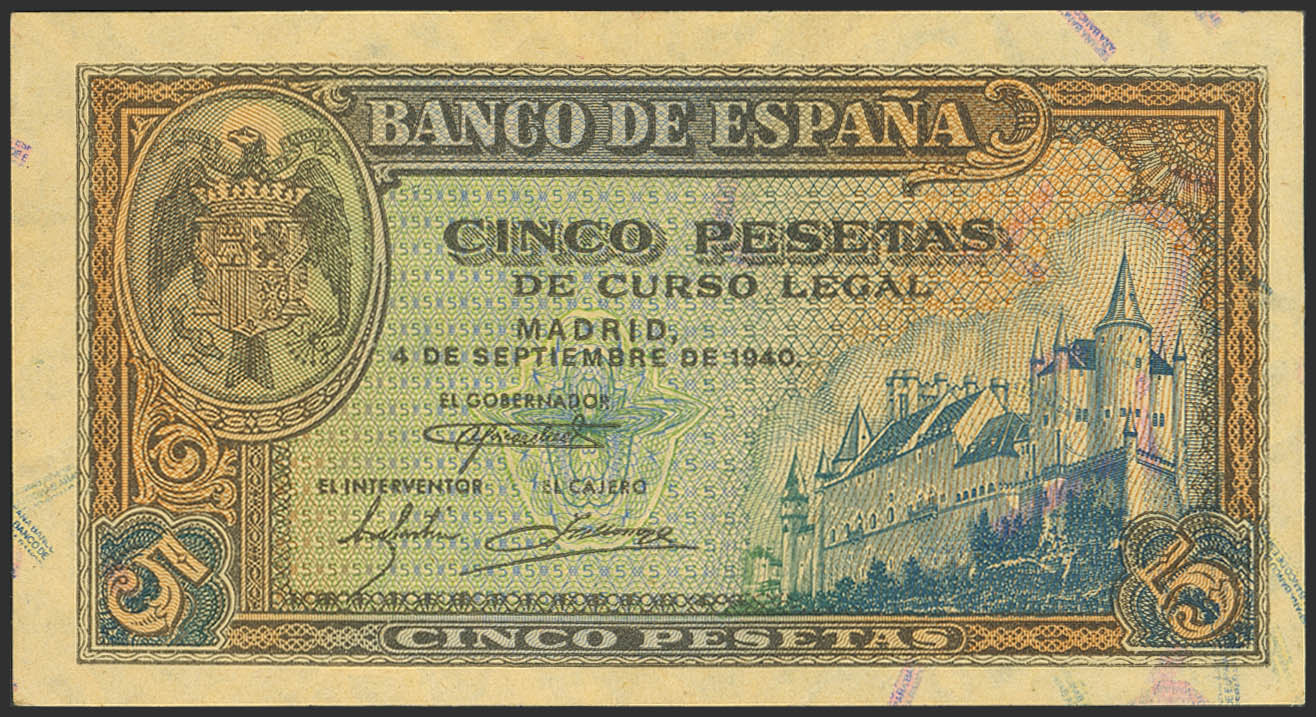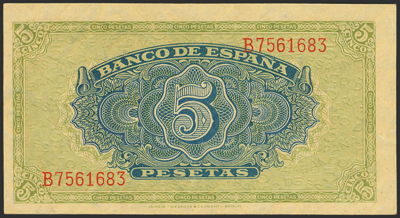5 Pesetas. 4 de Septiembre de 1940. Serie B. (Edifil 2023: 443a). Conserva gran parte de su apresto original. EBC.
