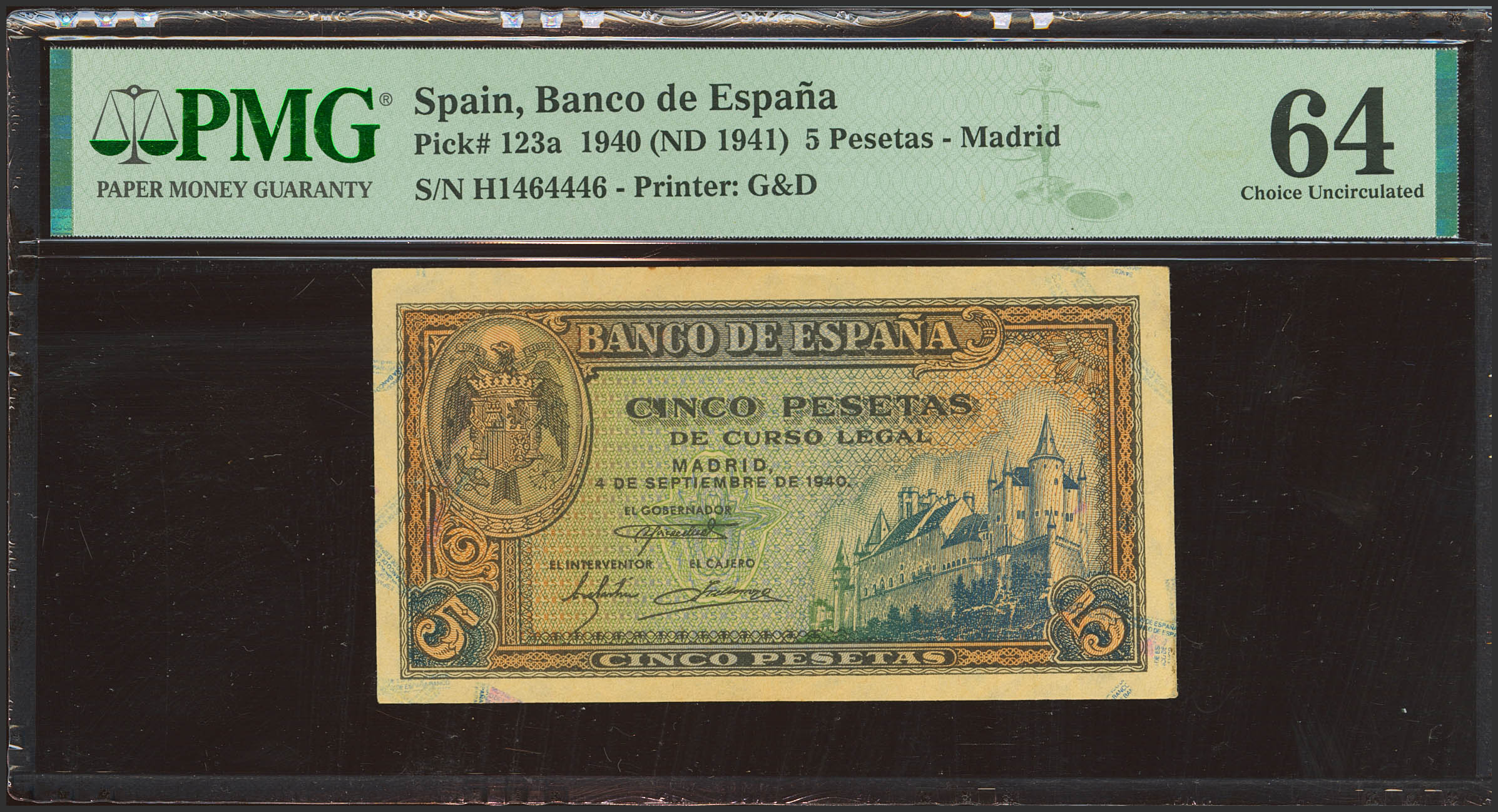 5 Pesetas. 4 de Septiembre de 1940. Serie H. (Edifil 2021: 443a, Pick: 123a). SC. Encapsulado PMG64.