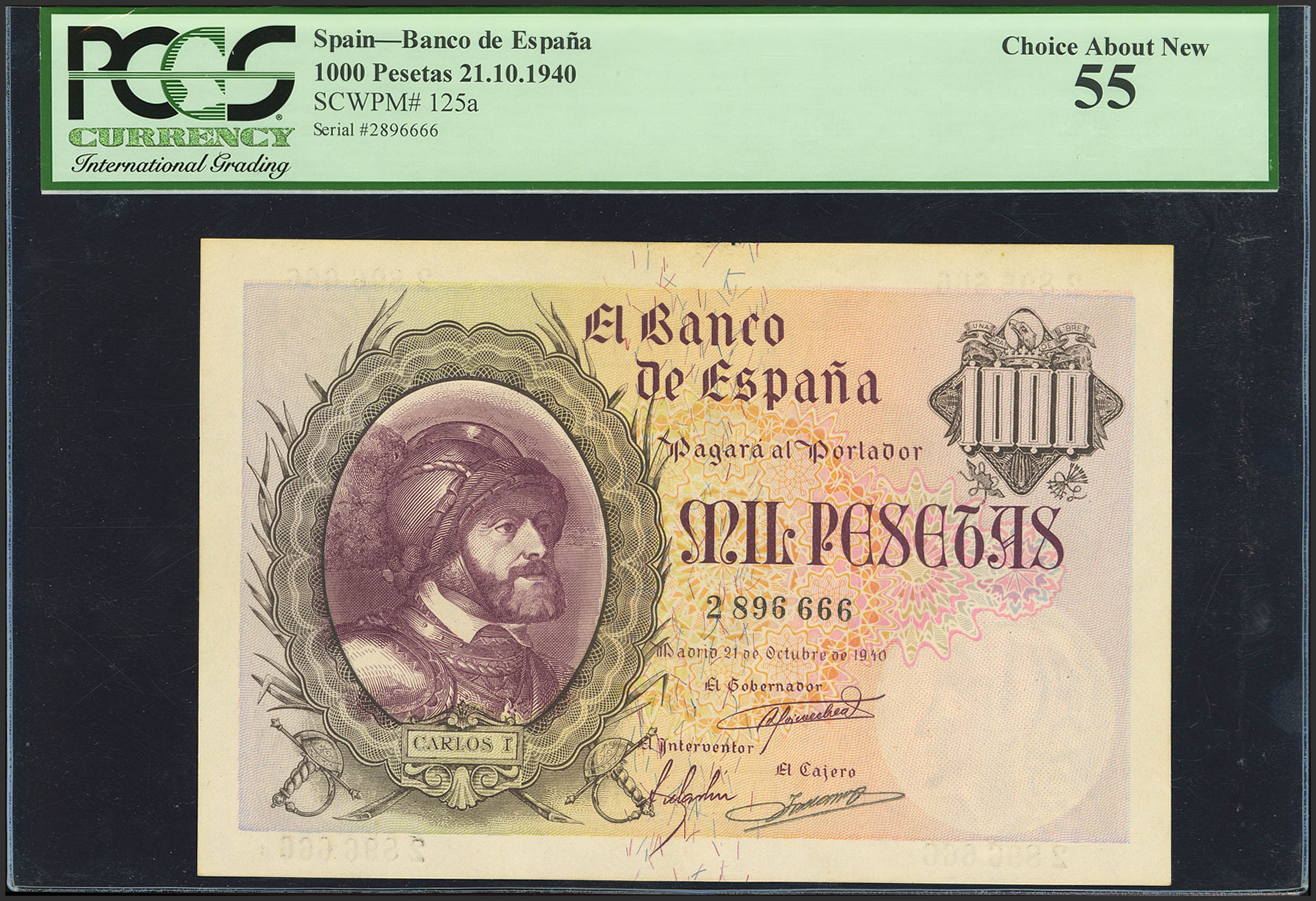 1000 Pesetas. 21 de Octubre de 1940. Sin serie. (Edifil 2023: 445, Pick: 125). Inusual en esta calidad. EBC+. Encapsulado PCGS55.