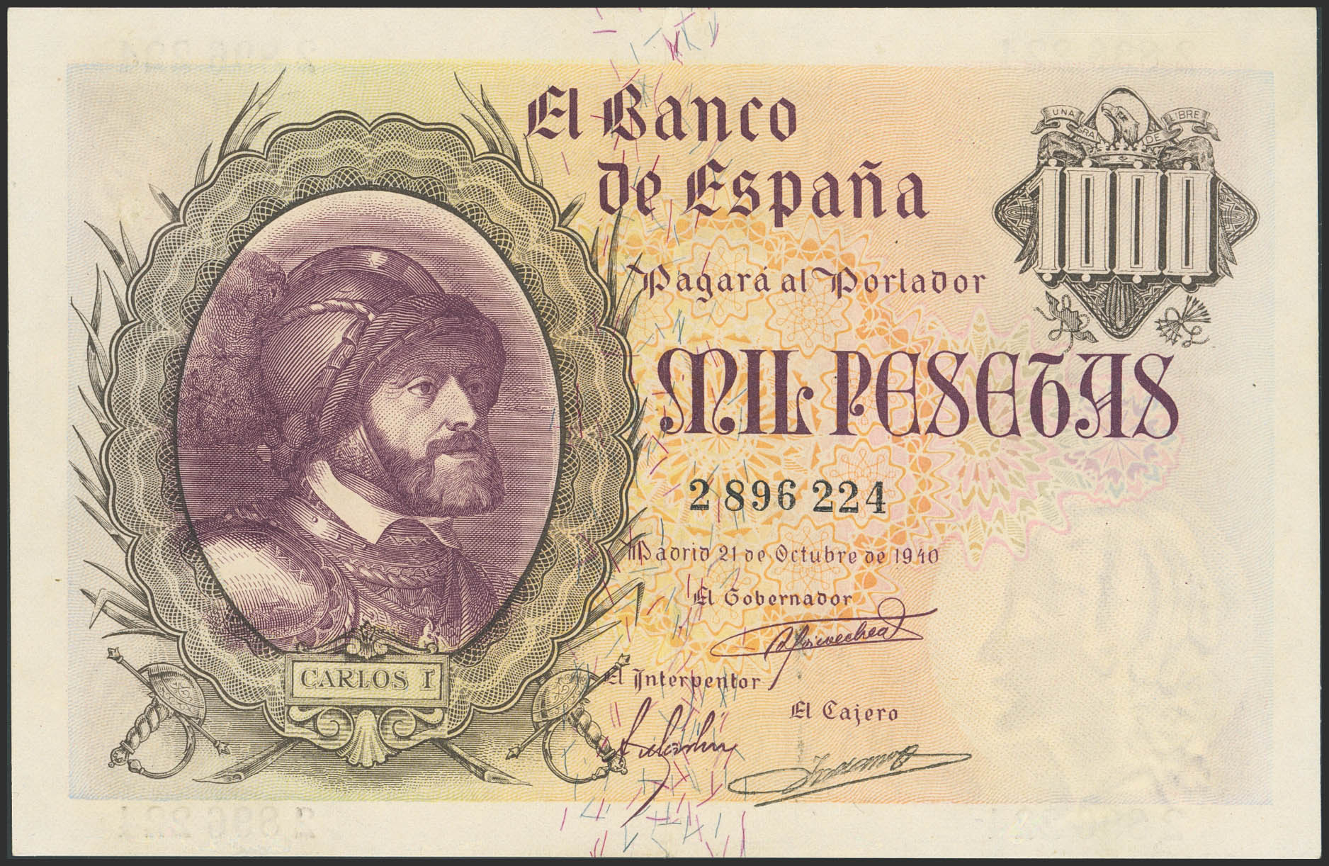 1000 Pesetas. 21 de Octubre de 1940. Sin serie. (Edifil 2023: 445). Raro en esta calidad, conserva gran parte de su apresto original, billete de gran presencia. EBC++.
