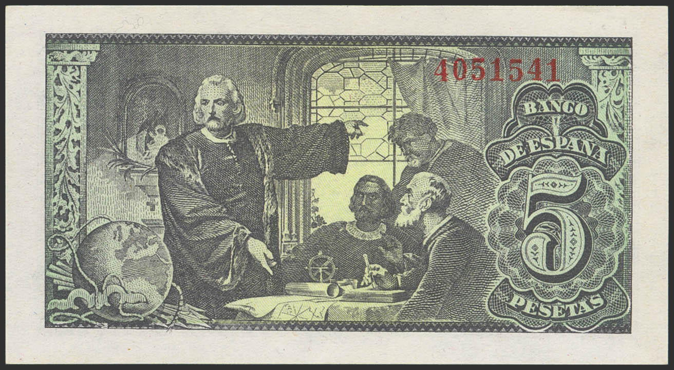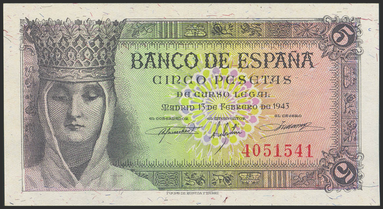 5 Pesetas. 13 de Febrero de 1943. Sin serie. (Edifil 2023: 446). Apresto original. SC--.