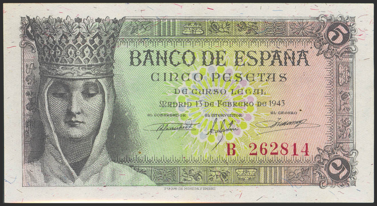5 Pesetas. 13 de Febrero de 1943. Serie B. (Edifil 2023: 446a). Apresto original. EBC+++.