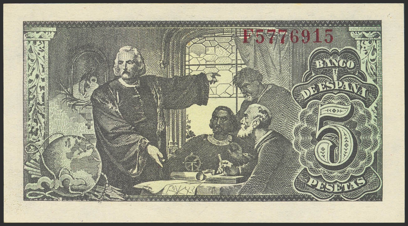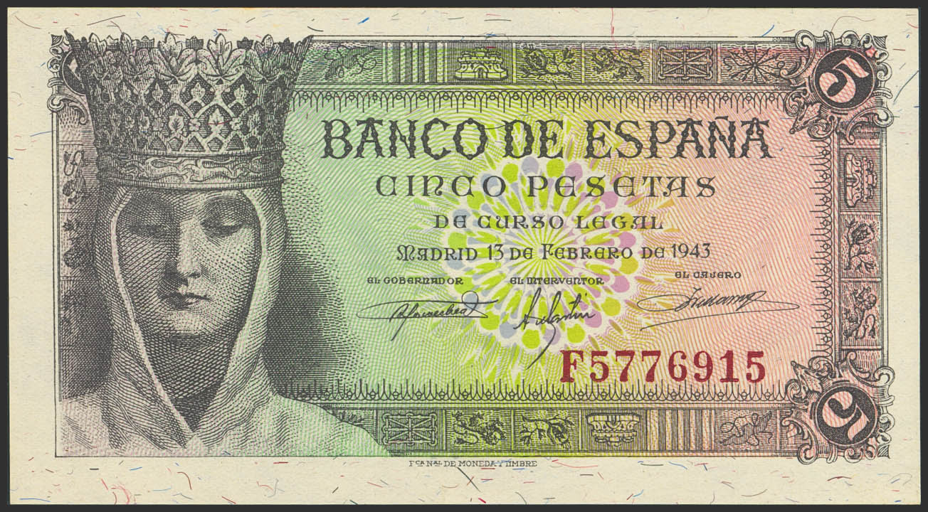 5 Pesetas. 13 de Febrero de 1943. Serie F. (Edifil 2023: 446a). Apresto original. SC.