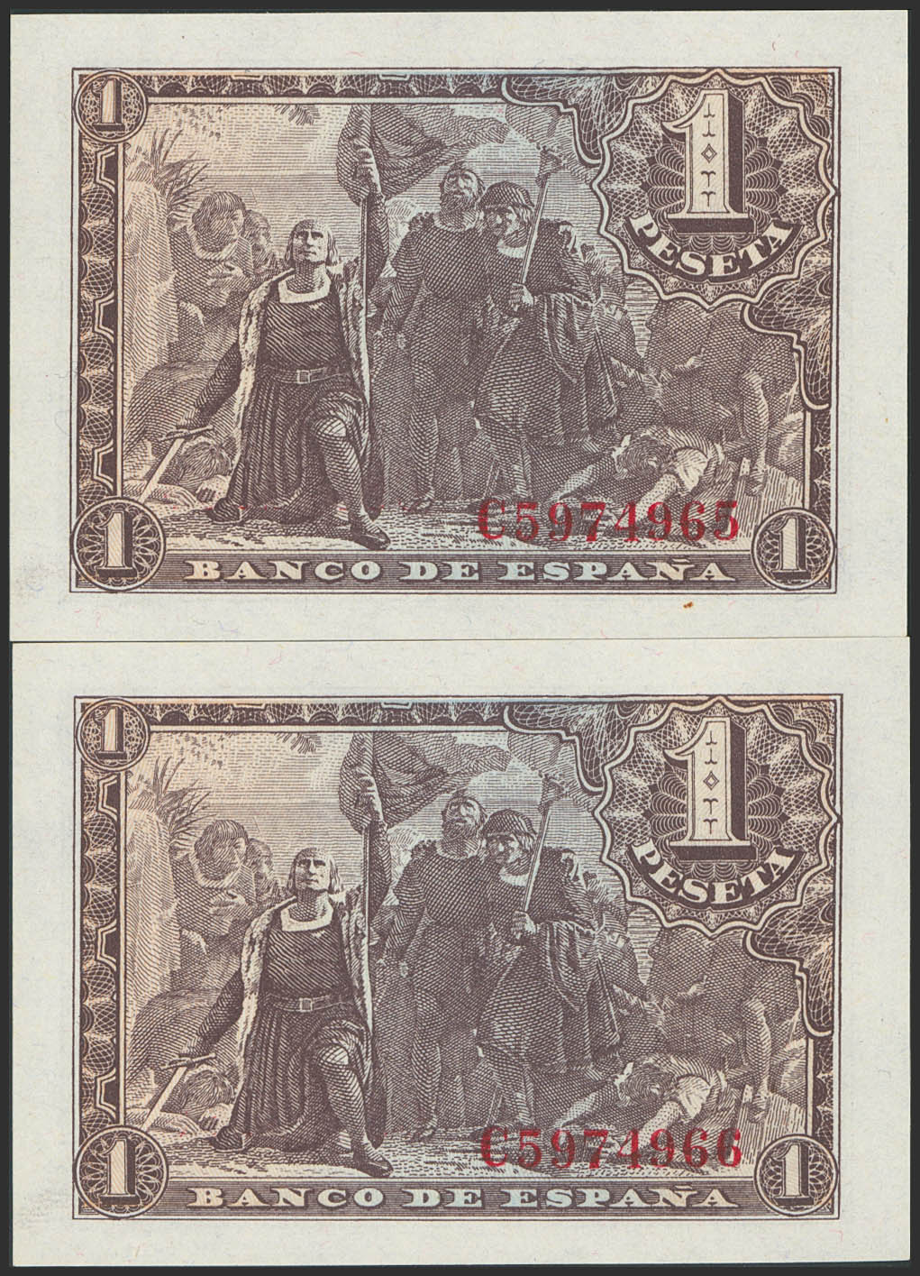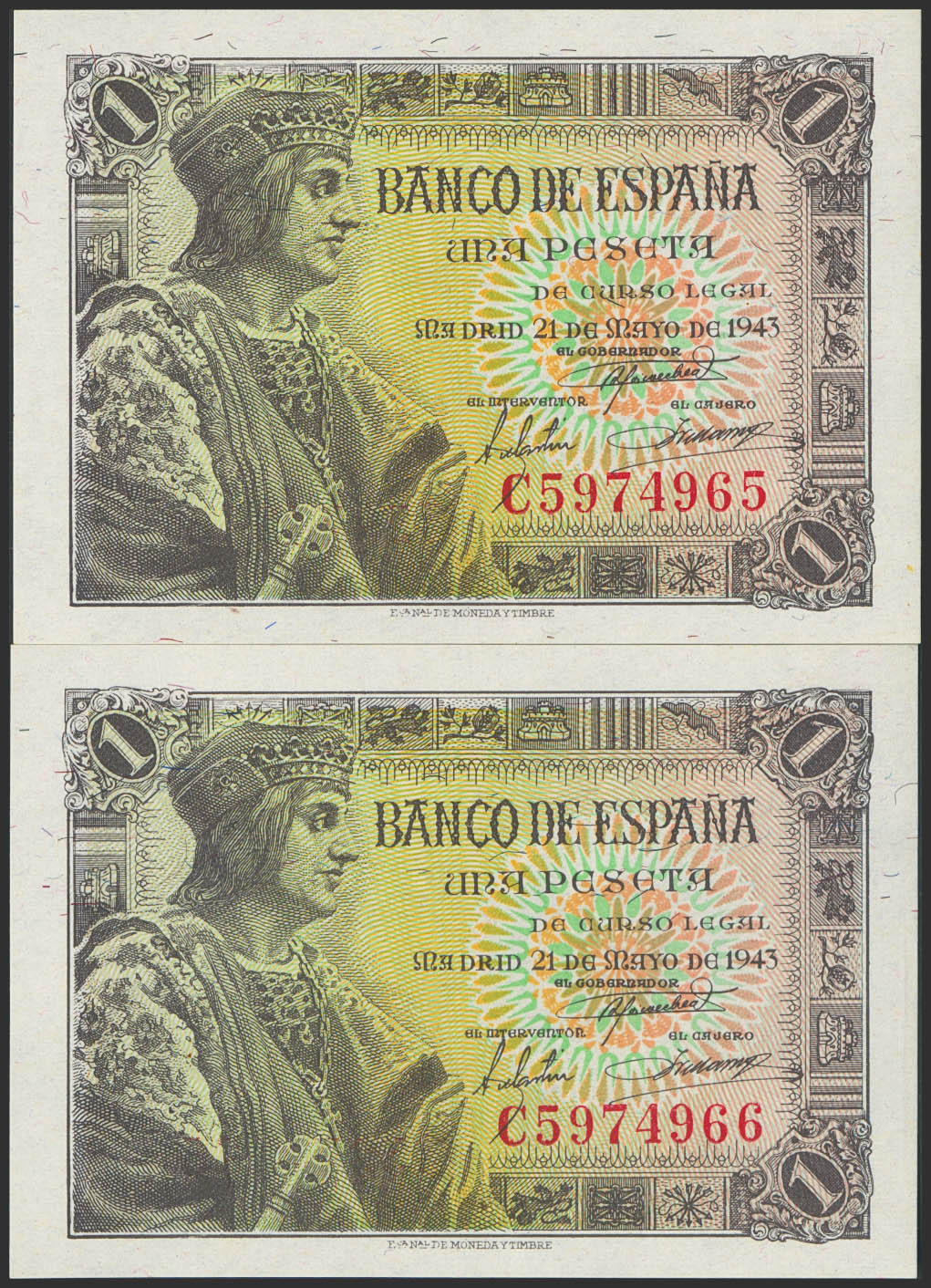 1 Peseta. 21 de Mayo de 1943. Pareja correlativa. Serie C. (Edifil 2023: 447a). Apresto original. SC.