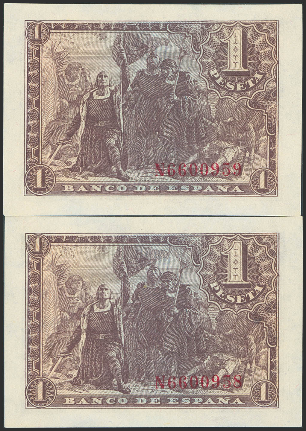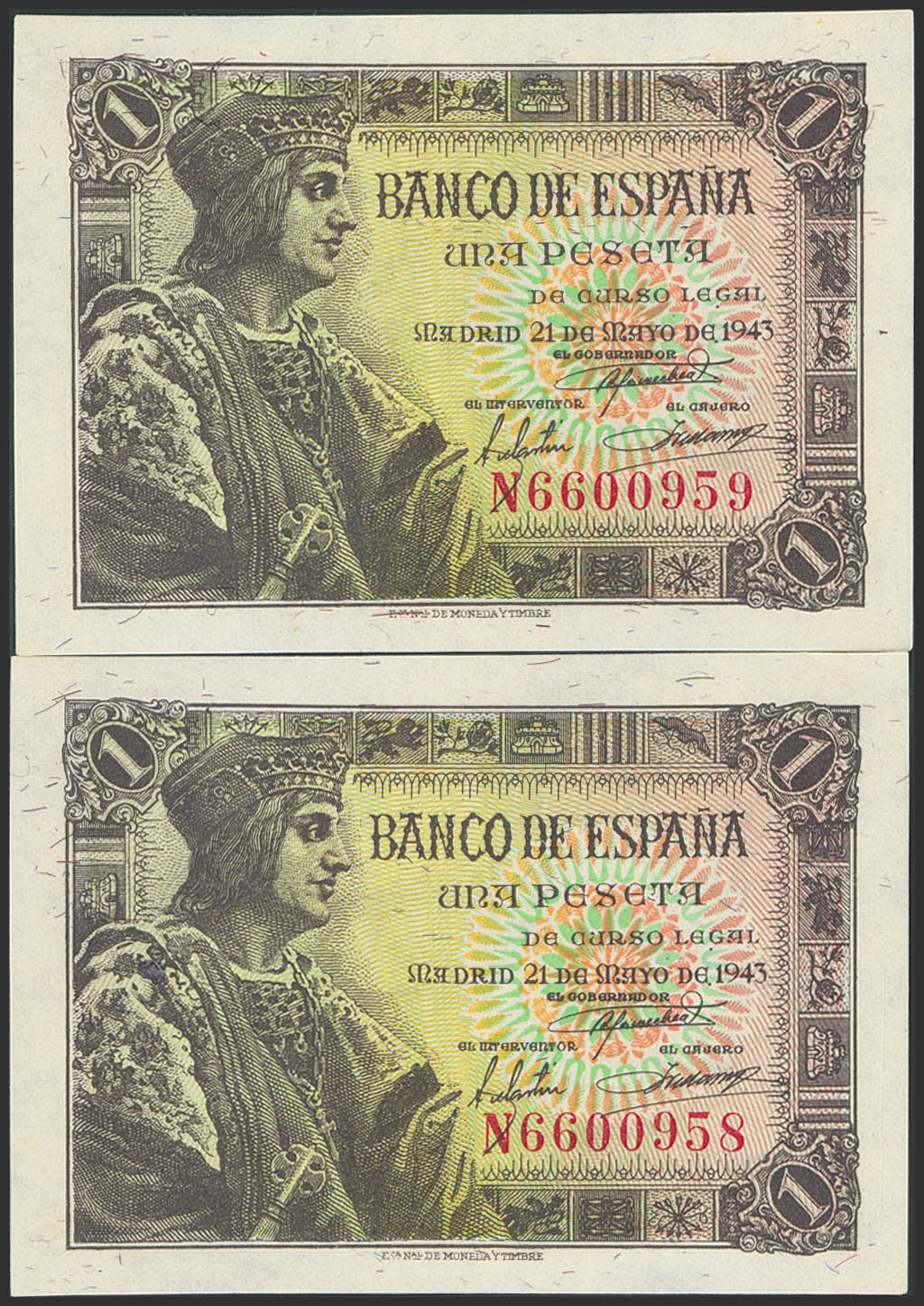 1 Peseta. 21 de Mayo de 1943. Pareja correlativa. Serie N, última serie emitida. (Edifil 2023: 447b). Conserva parte de su apresto original. EBC.