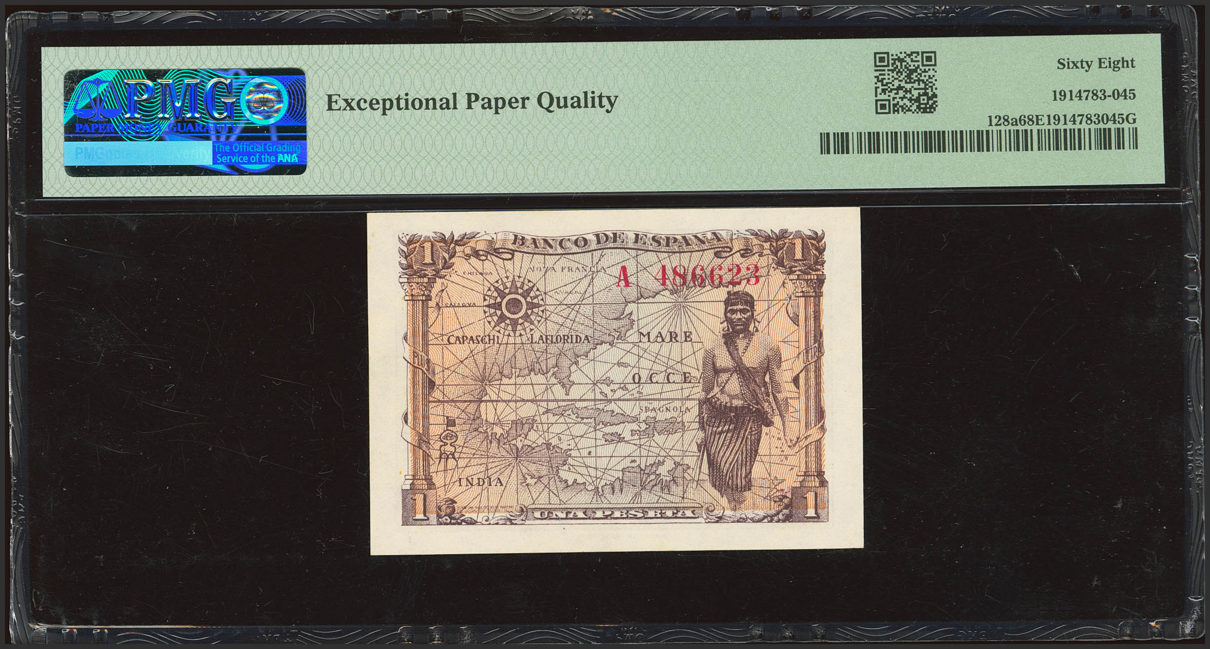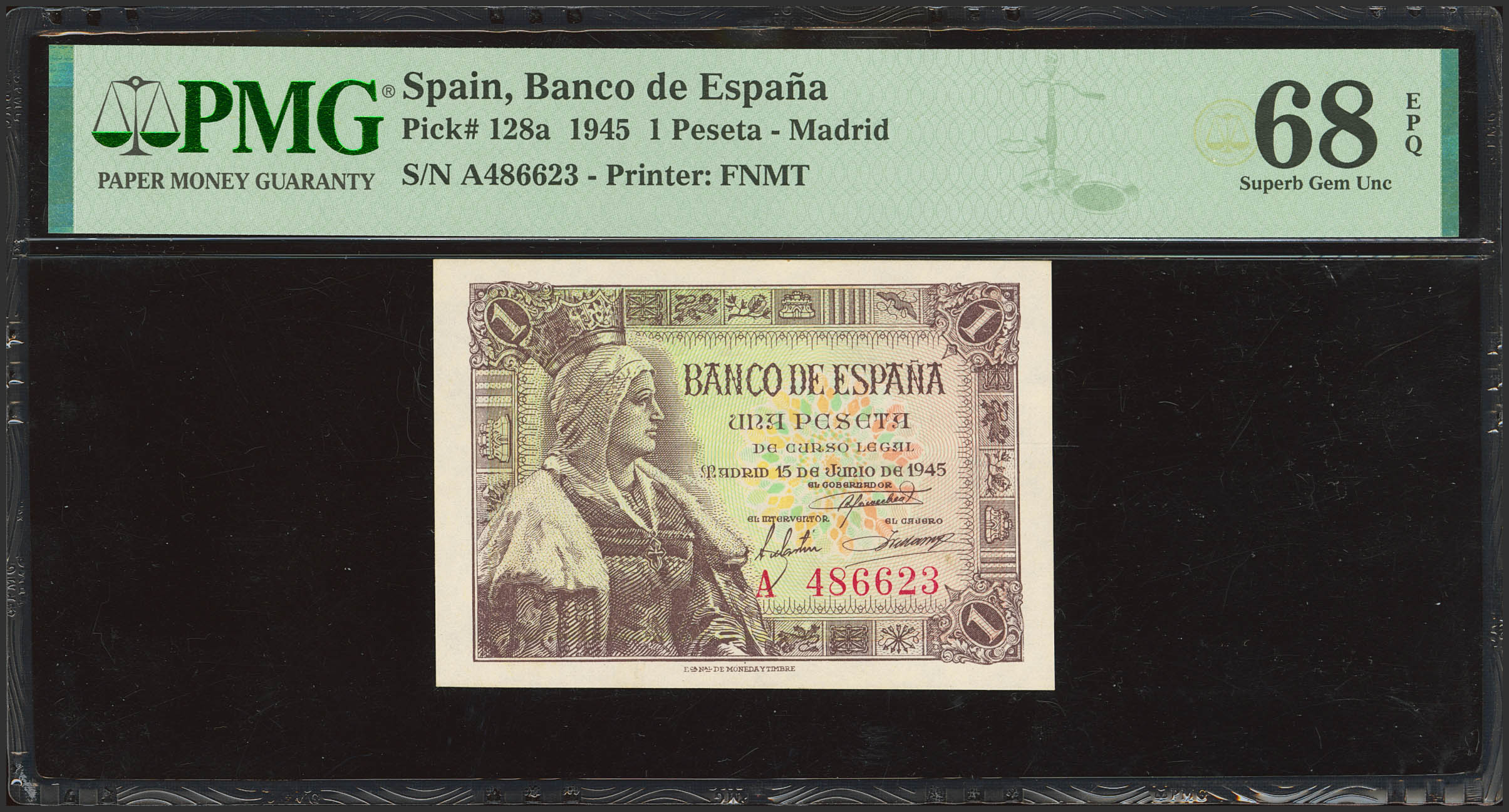 1 Peseta. 15 de Junio de 1945. Serie A. (Edifil 2023: 448a, Pick: 128a). Raro en esta calidad, apresto original. SC. Encapsulado PMG68EPQ.