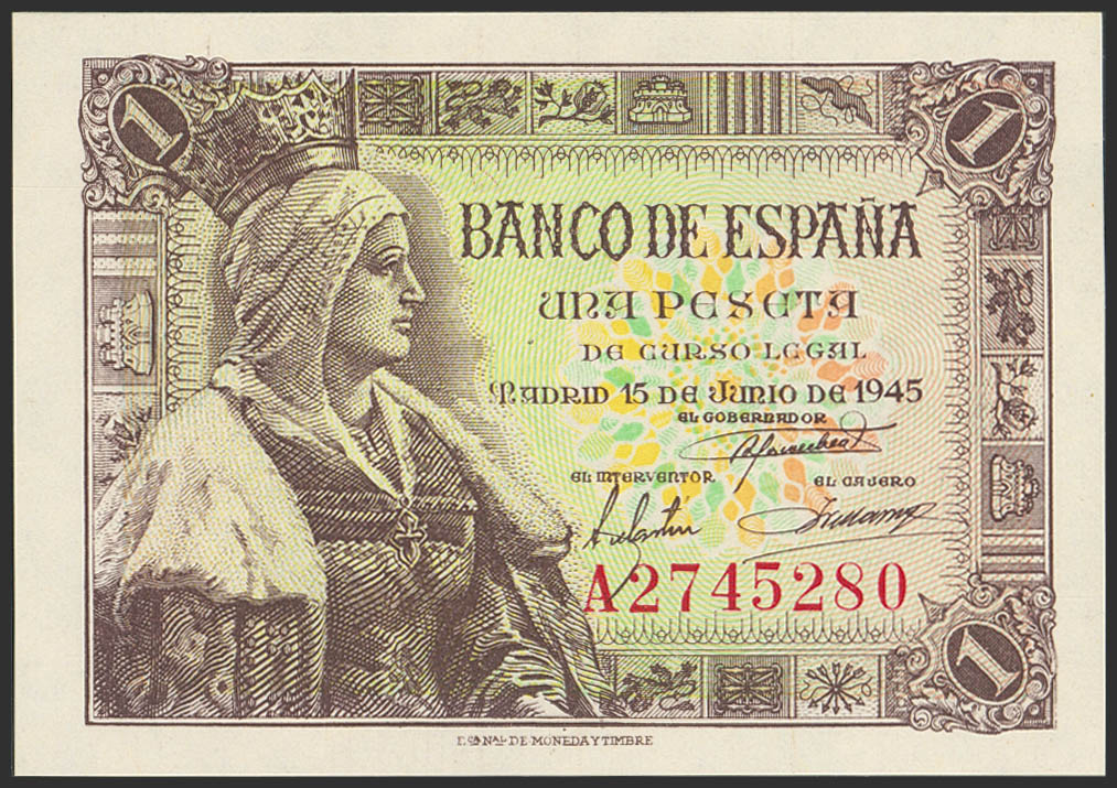 1 Peseta. 15 de Junio de 1945. Serie A. (Edifil 2023: 448a). Apresto original. SC.