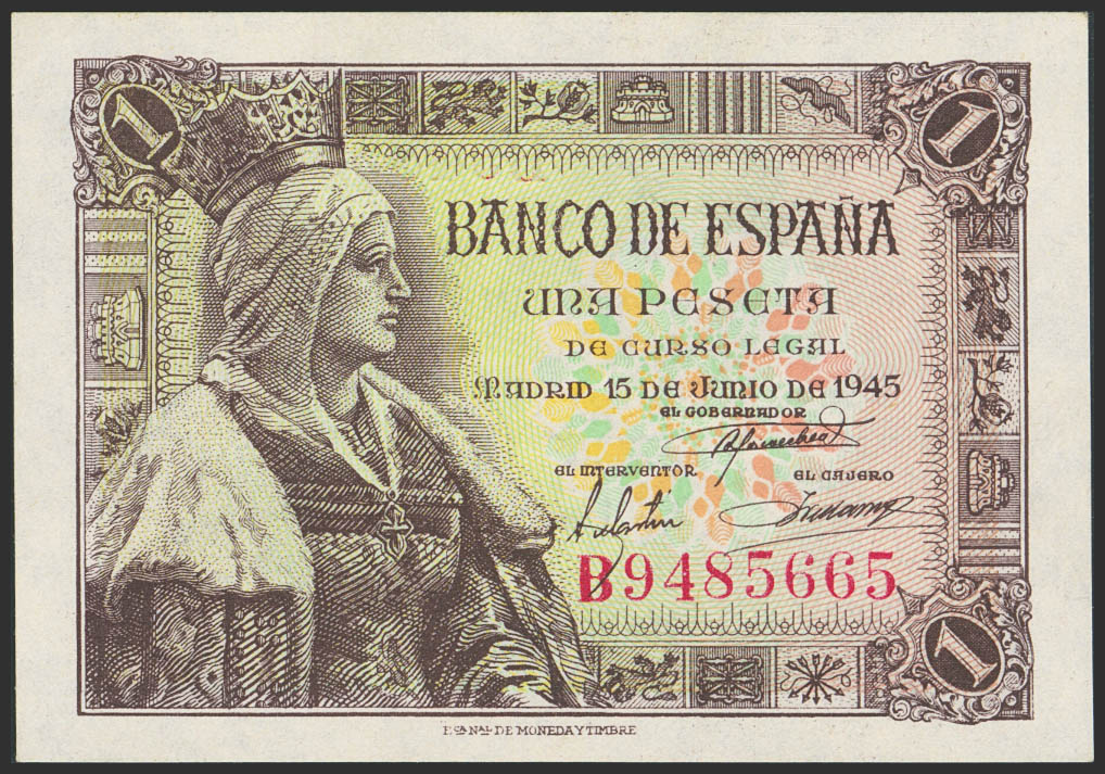 1 Peseta. 15 de Junio de 1945. Serie B. (Edifil 2023: 448a). Apresto original. SC-.
