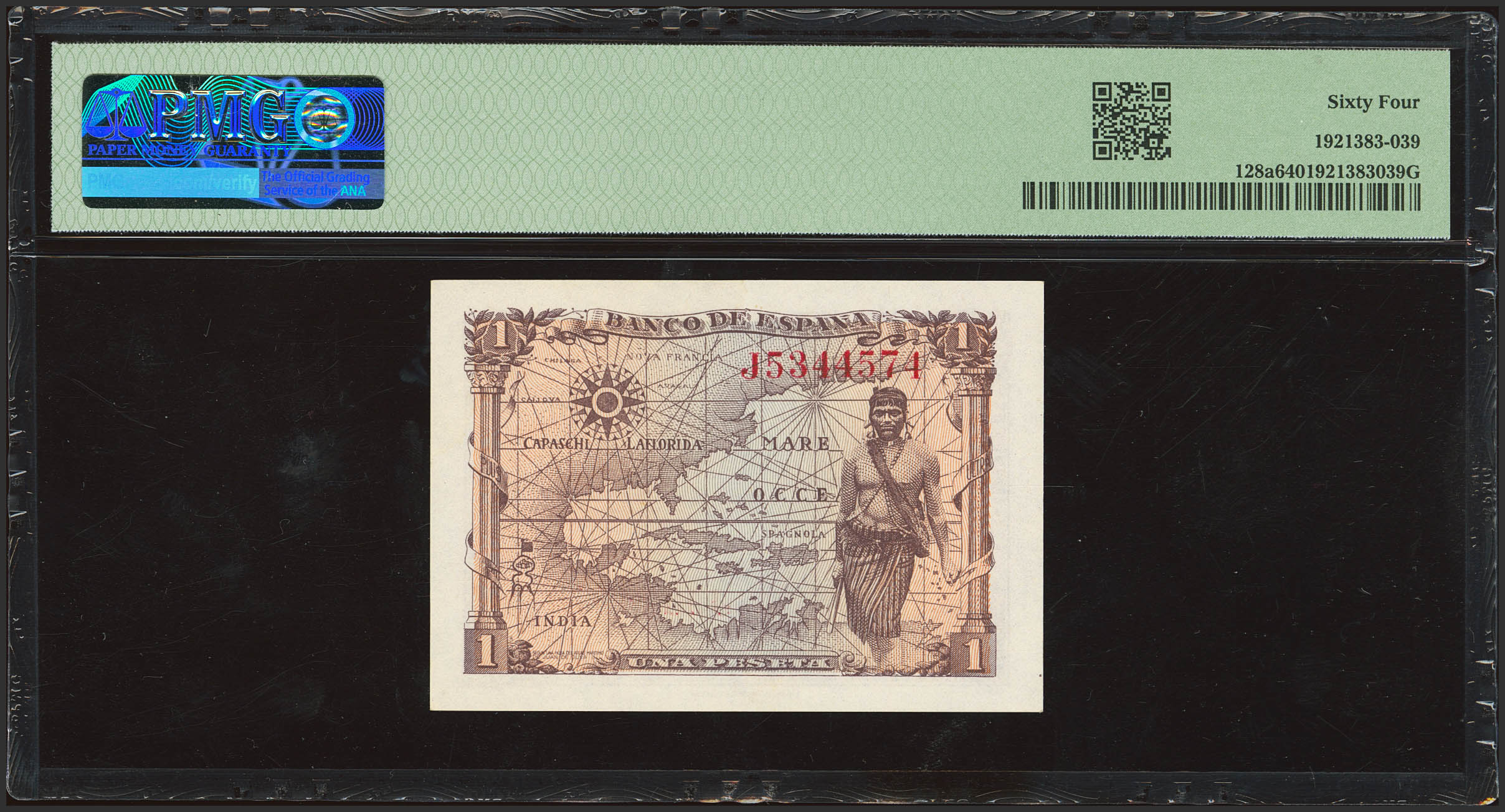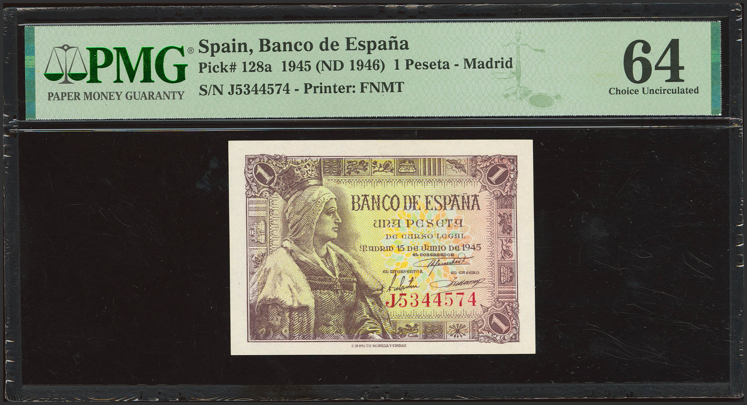 1 Peseta. 15 de Junio de 1945. Serie J. (Edifil 2023: 448a, Pick: 128a). SC. Encapsulado PMG64.