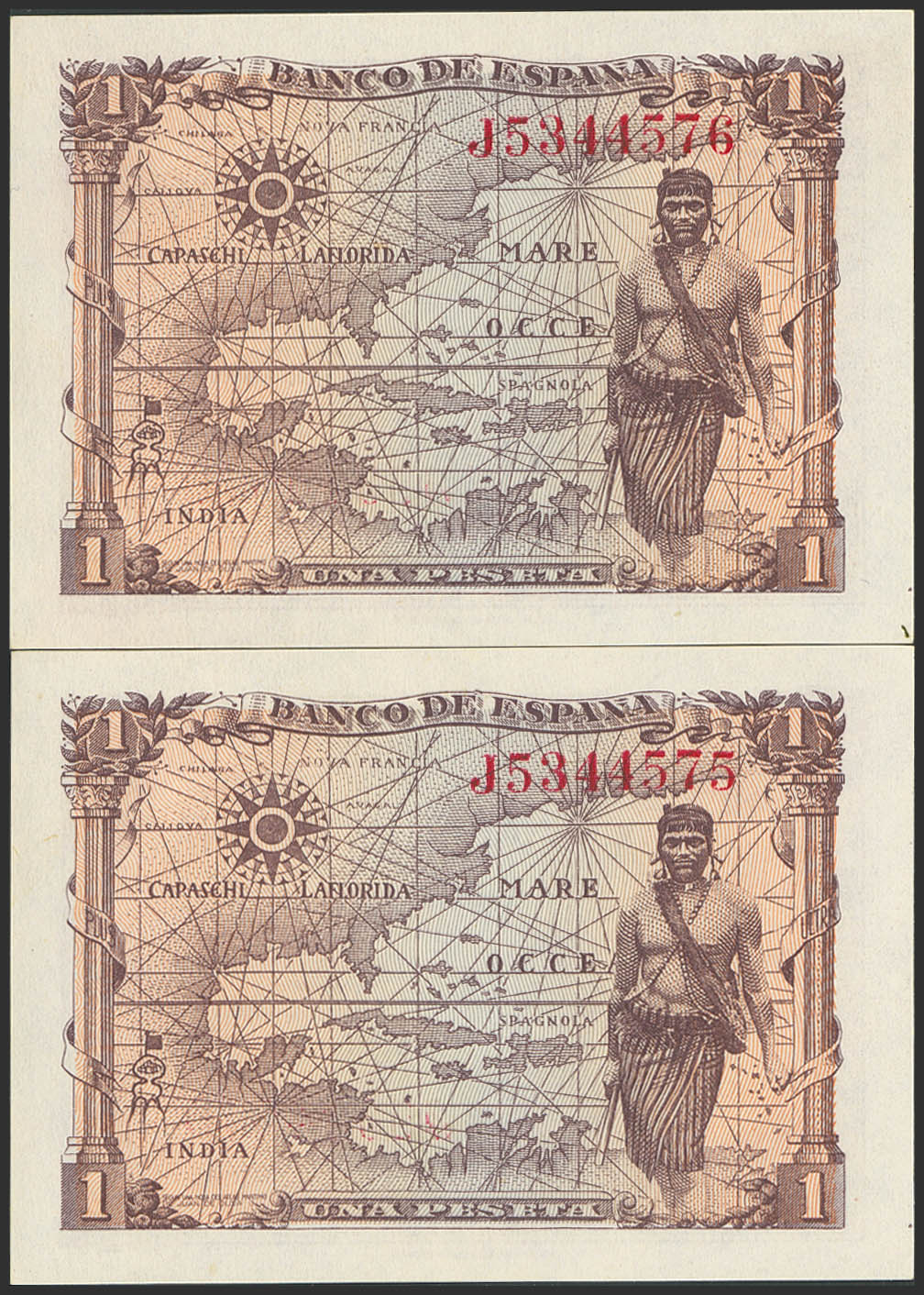 1 Peseta. 15 de Junio de 1945. Pareja correlativa. Serie J. (Edifil 2023: 448a). Apresto original. SC.