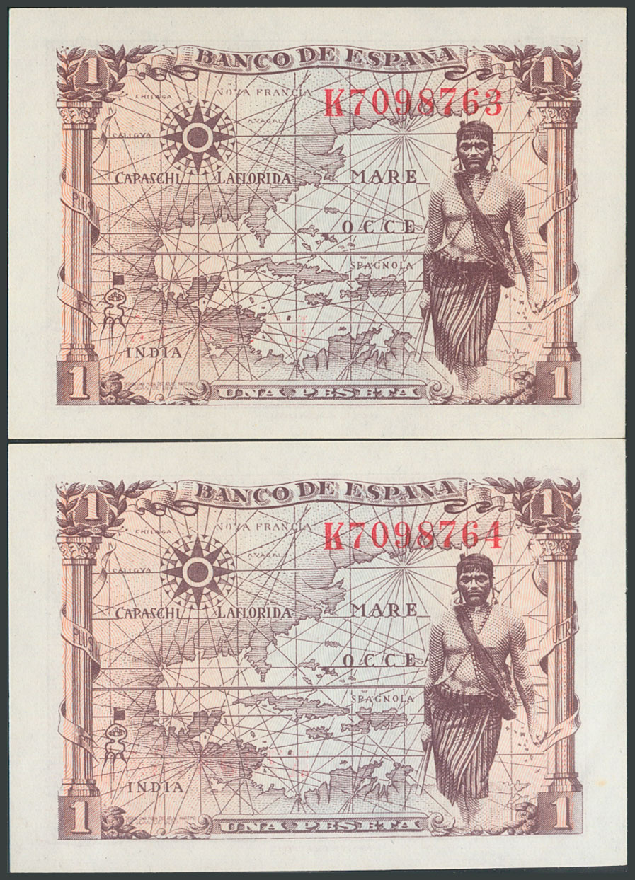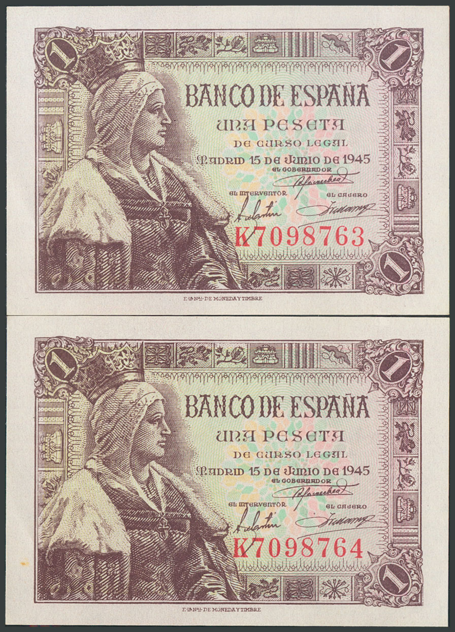 1 Peseta. 15 de Junio de 1945. Pareja correlativa. Serie K. (Edifil 2017: 448a). Apresto original. SC/SC-.
