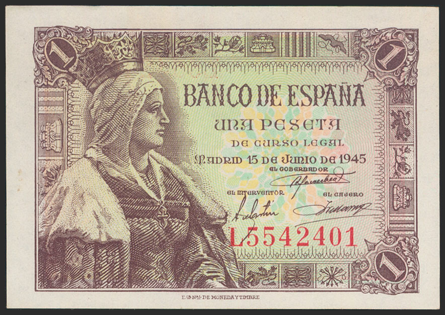 1 Peseta. 15 de Junio de 1945. Serie L. (Edifil 2021: 448a). Apresto original. SC-.