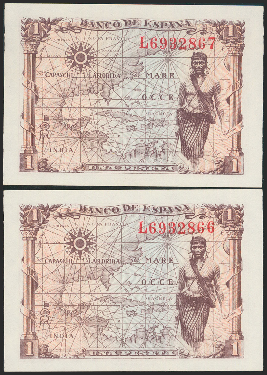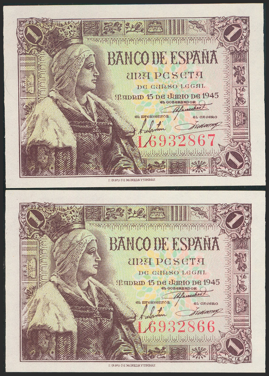 1 Peseta. 15 de Junio de 1945. Pareja correlativa. Serie L. (Edifil 2021: 448a). Apresto original. SC.