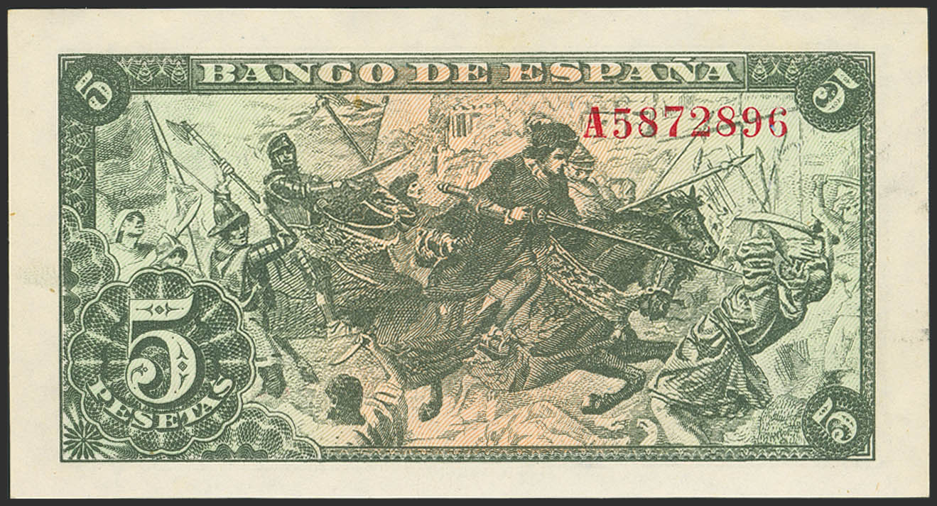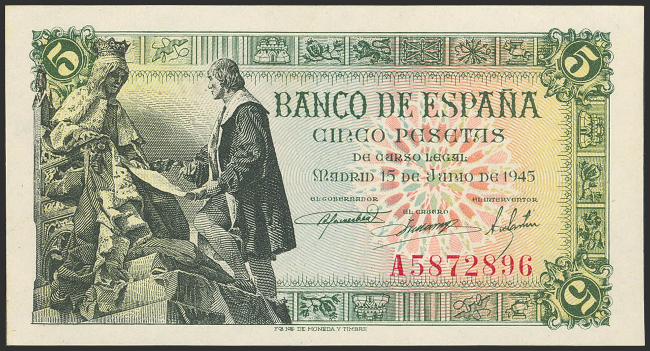 5 Pesetas. 15 de Junio de 1945. Serie A. (Edifil 2023: 449a). Apresto original. SC.