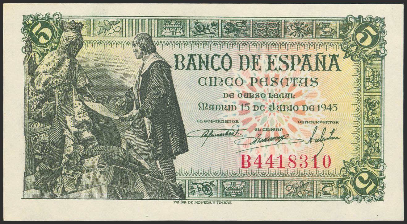 5 Pesetas. 15 de Junio de 1945. Serie B. (Edifil 2023: 449a). Apresto original. SC.
