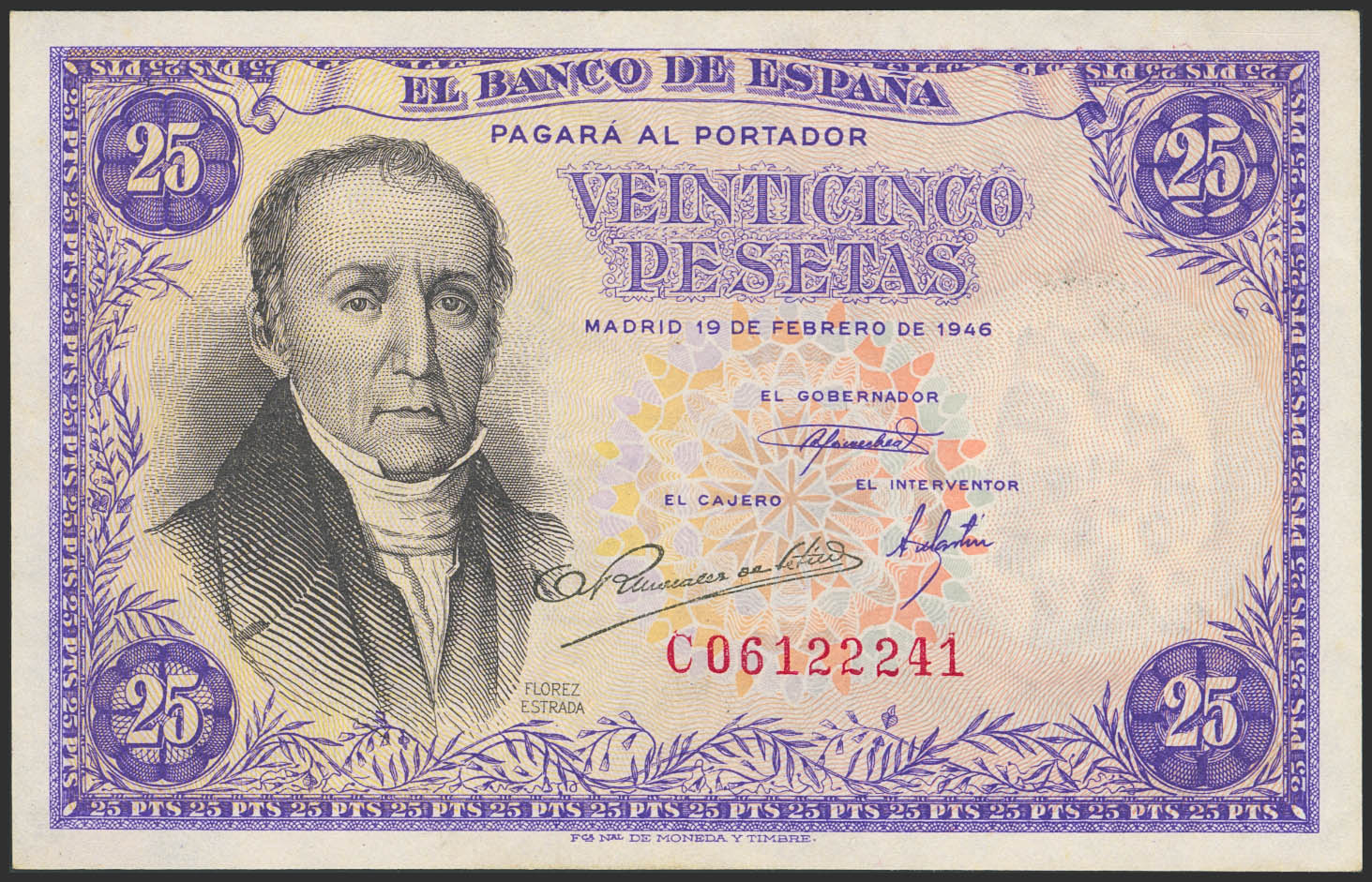 25 Pesetas. 19 de Febrero de 1946. Serie C. (Edifil 2023: 450a). Apresto original. SC.