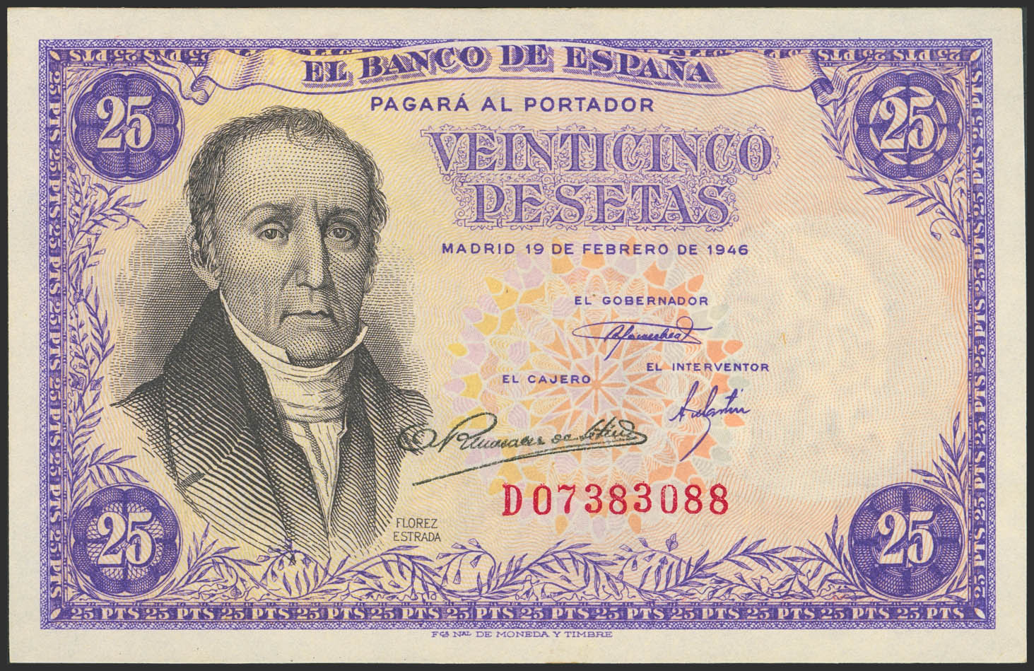 25 Pesetas. 19 de Febrero de 1946. Serie D. (Edifil 2023: 450a). Apresto original. SC.