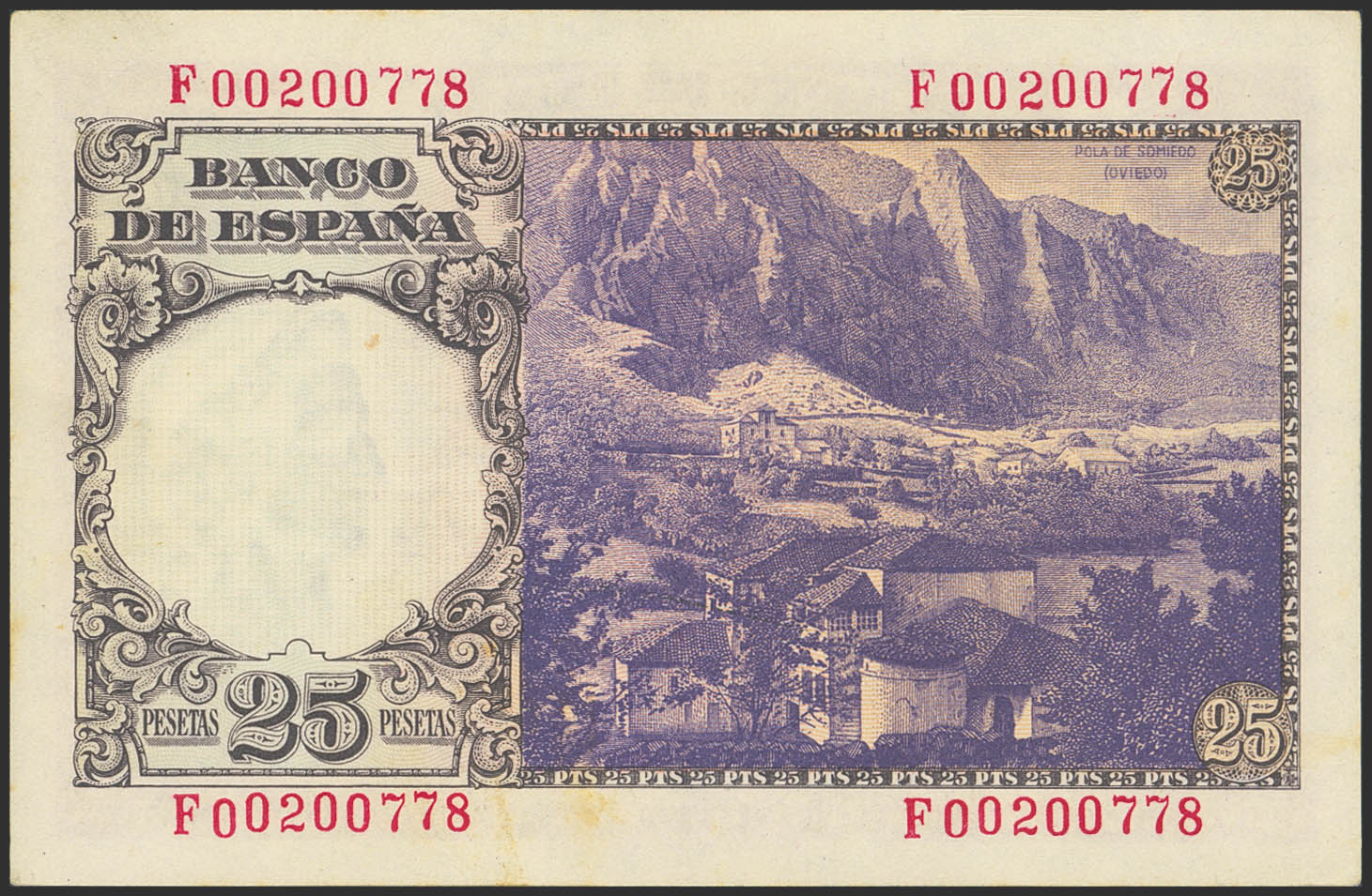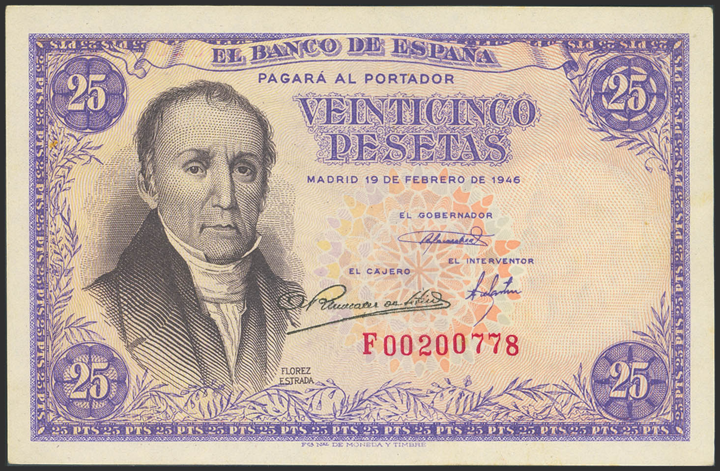 25 Pesetas. 19 de Febrero de 1946. Serie F. (Edifil 2023: 450). Conserva gran parte de su apresto original. EBC+++.