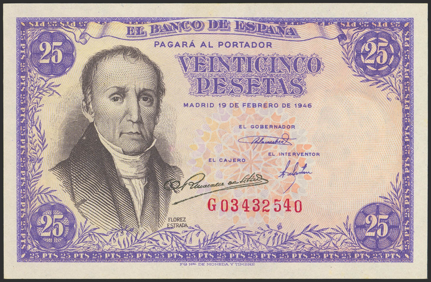 25 Pesetas. 19 de Febrero de 1946. Serie G. (Edifil 2023: 450a). Apresto original. SC.