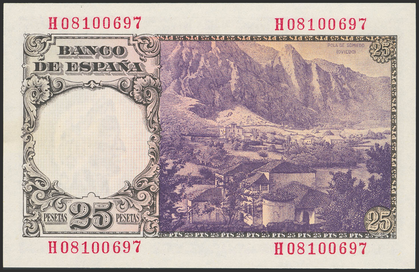 25 Pesetas. 19 de Febrero de 1946. Serie H. (Edifil 2023: 450a). Apresto original. SC.
