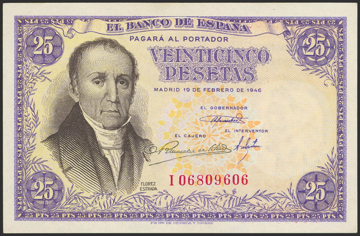 25 Pesetas. 19 de Febrero de 1946. Serie I. (Edifil 2023: 450a). Apresto original. SC.