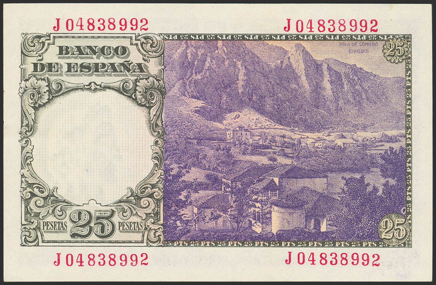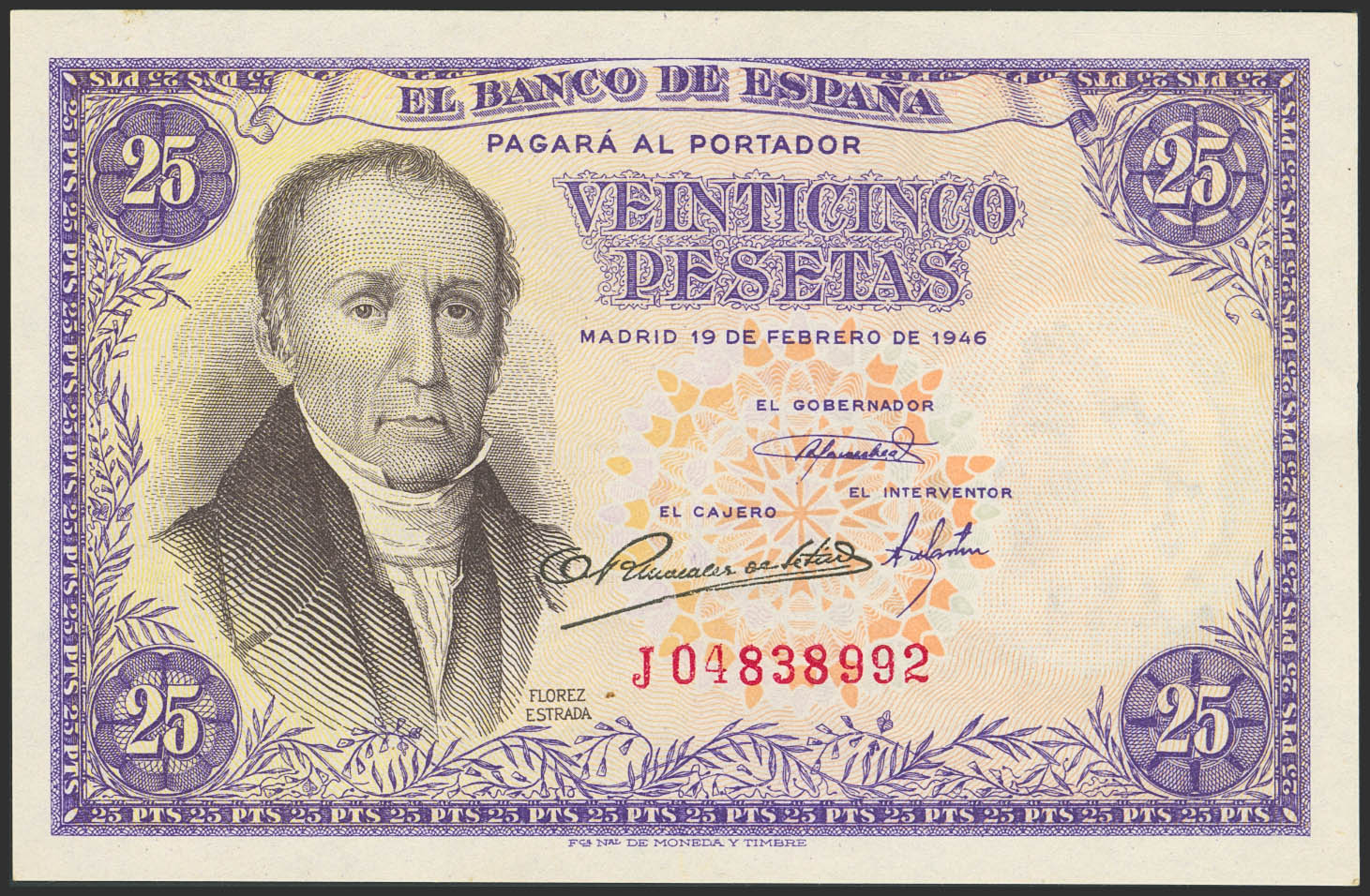 25 Pesetas. 19 de Febrero de 1946. Serie J. (Edifil 2023: 450a). Apresto original. SC.