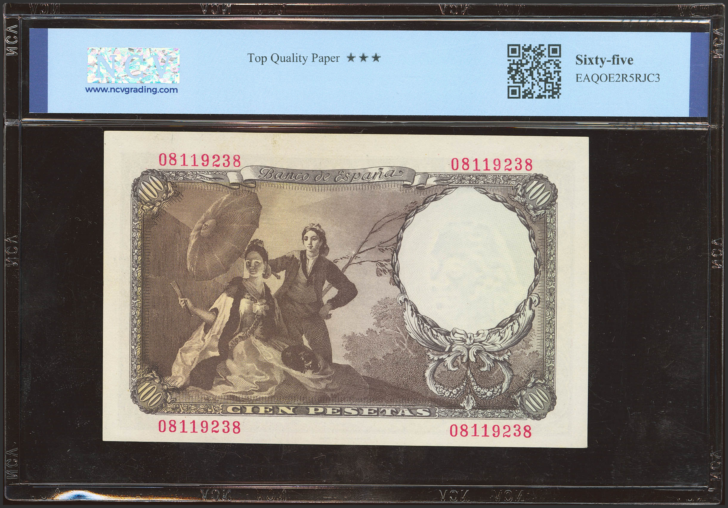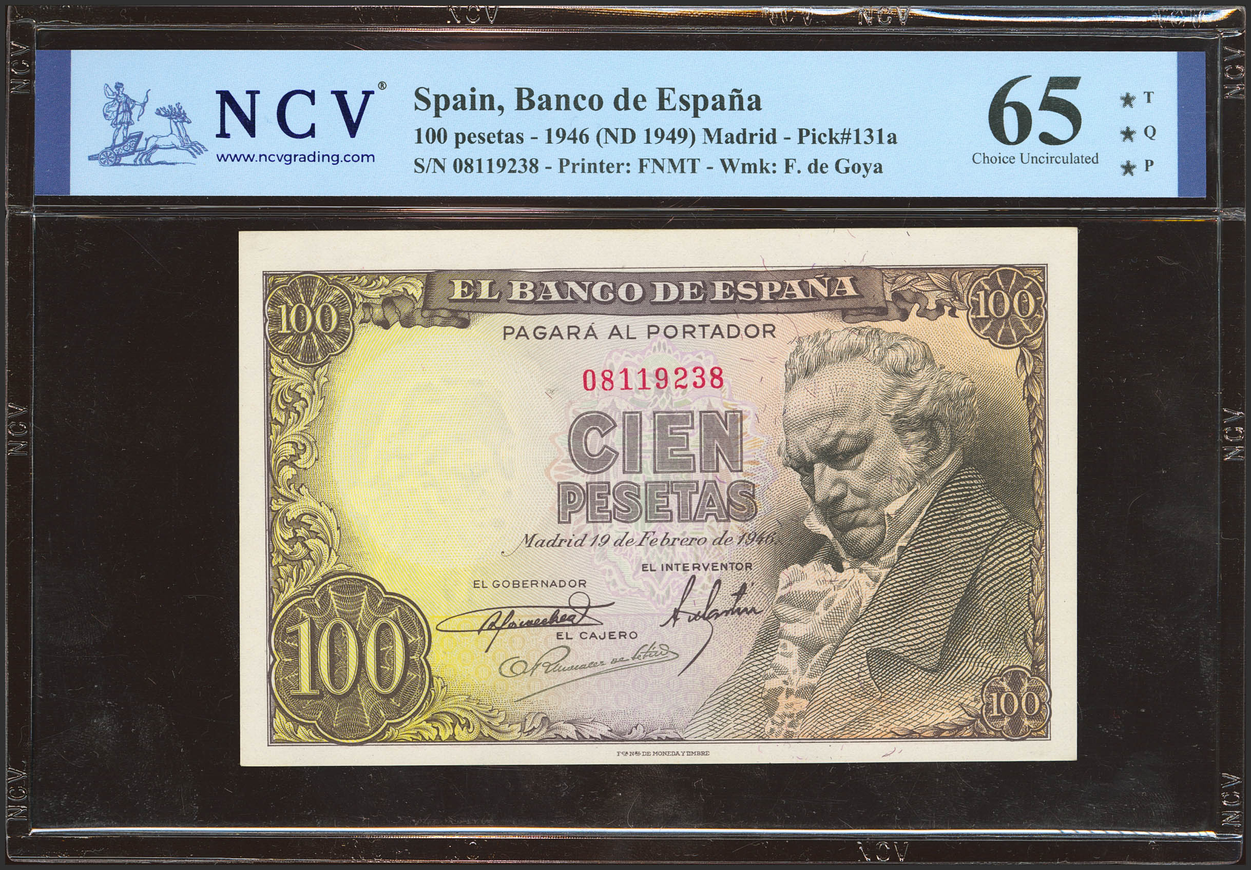100 Pesetas. 19 de Febrero de 1946. Sin serie. (Edifil 2023: 451, Pick: 131a). Raro en esta excepcional calidad, apresto original. SC. Encapsulado NCV65TQP.