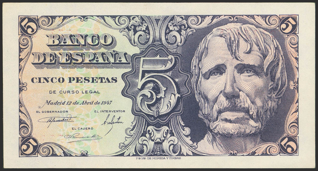 5 Pesetas. 12 de Abril de 1947. Serie B. (Edifil 2023: 454a). Apresto original. SC.