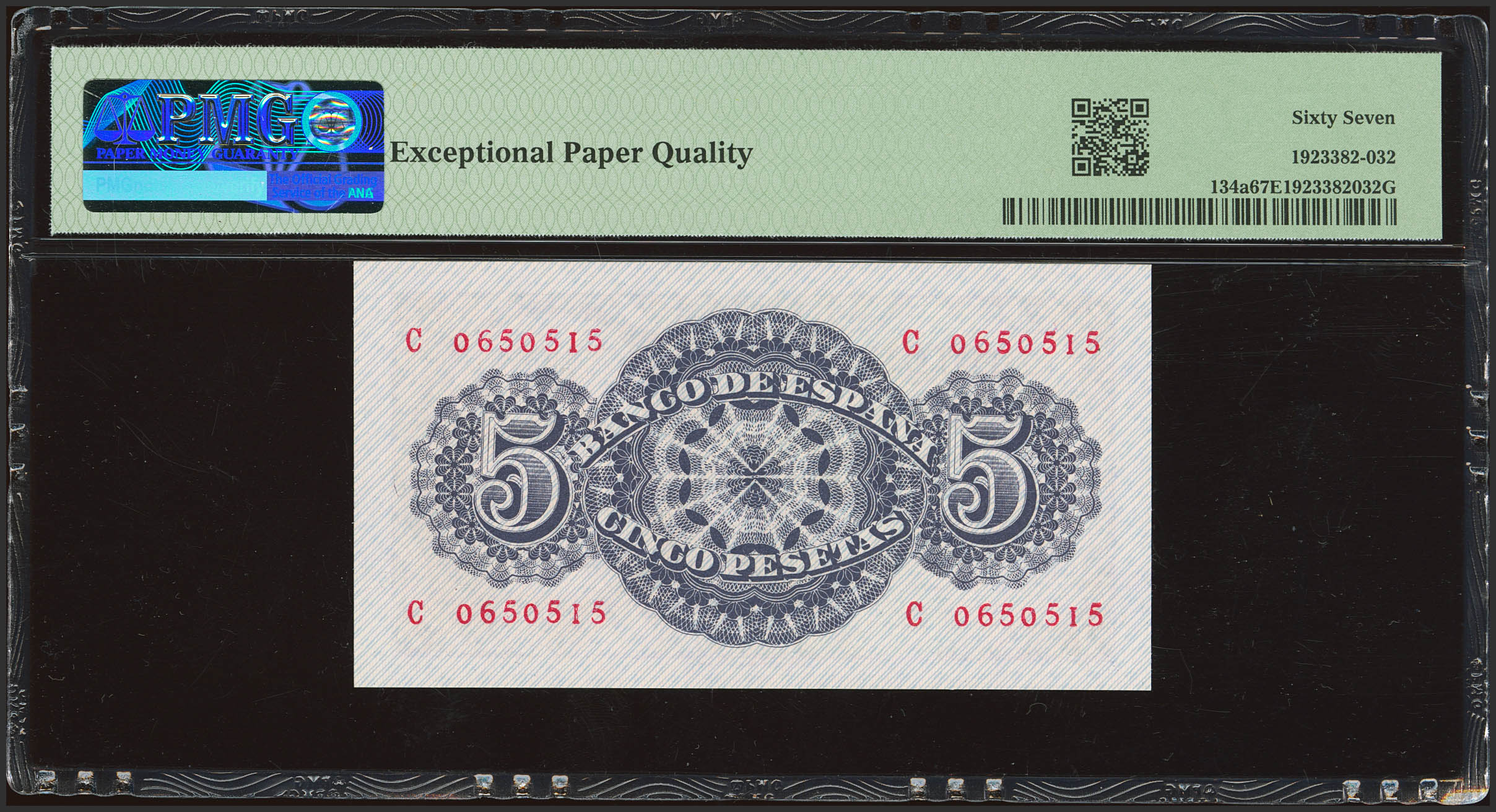 5 Pesetas. 12 de Abril de 1947. Serie C. (Edifil 2023: 454a, Pick: 134a). Apresto original. SC. Encapsulado PMG67EPQ.