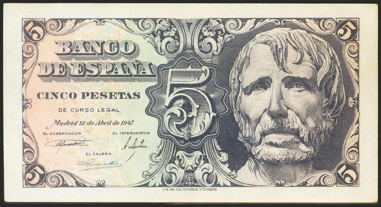 5 Pesetas. 12 de Abril de 1947. Serie C. (Edifil 2021: 454a). Manchitas del tiempo y apresto original. SC-.