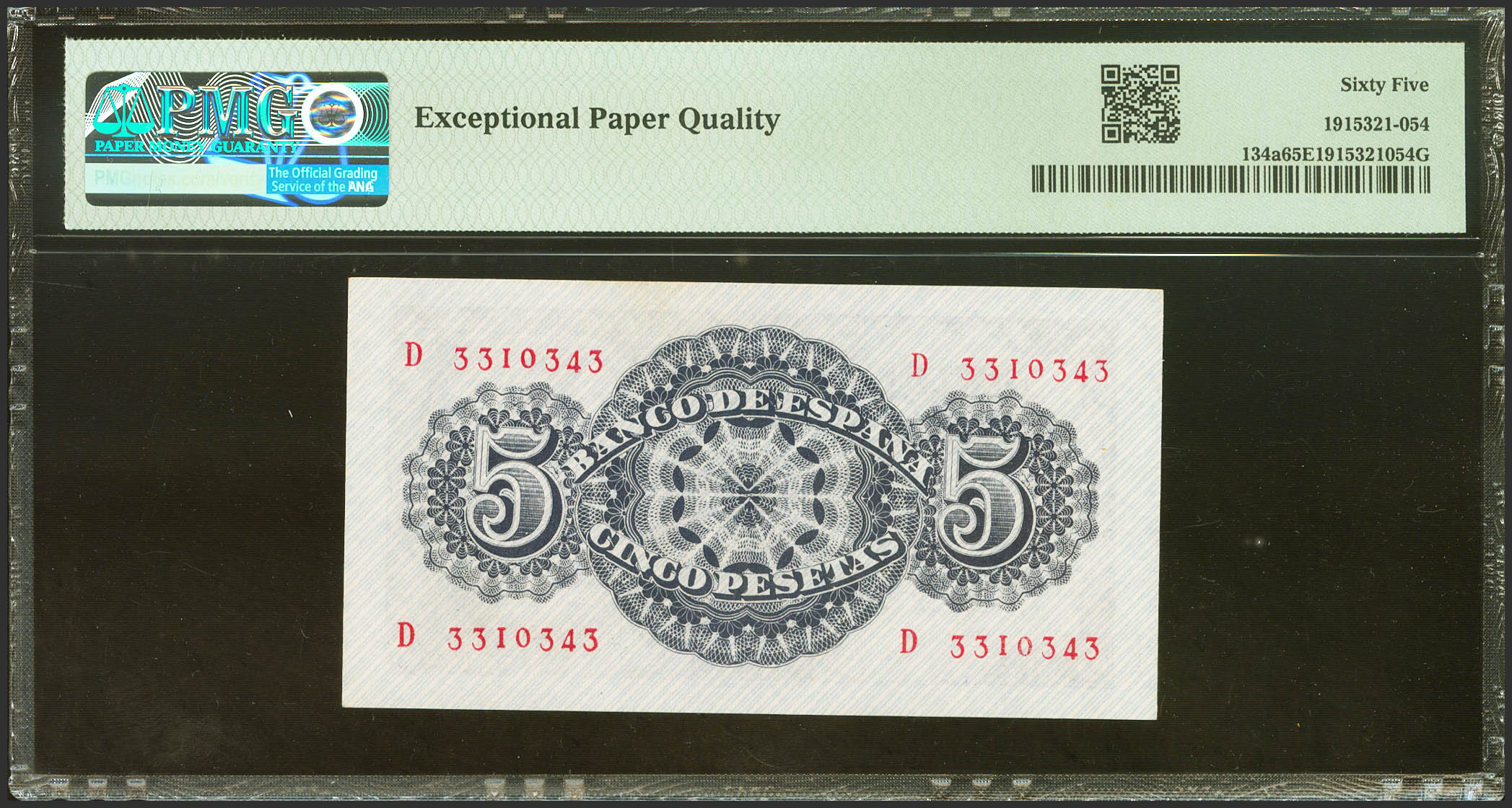 5 Pesetas. 12 de Abril de 1947. Serie D. (Edifil 2023: 454a, Pick: 134a). Raro en esta excepcional calidad, apresto original. SC. Encapsulado PMG65EPQ.