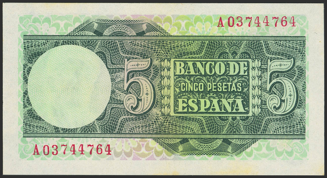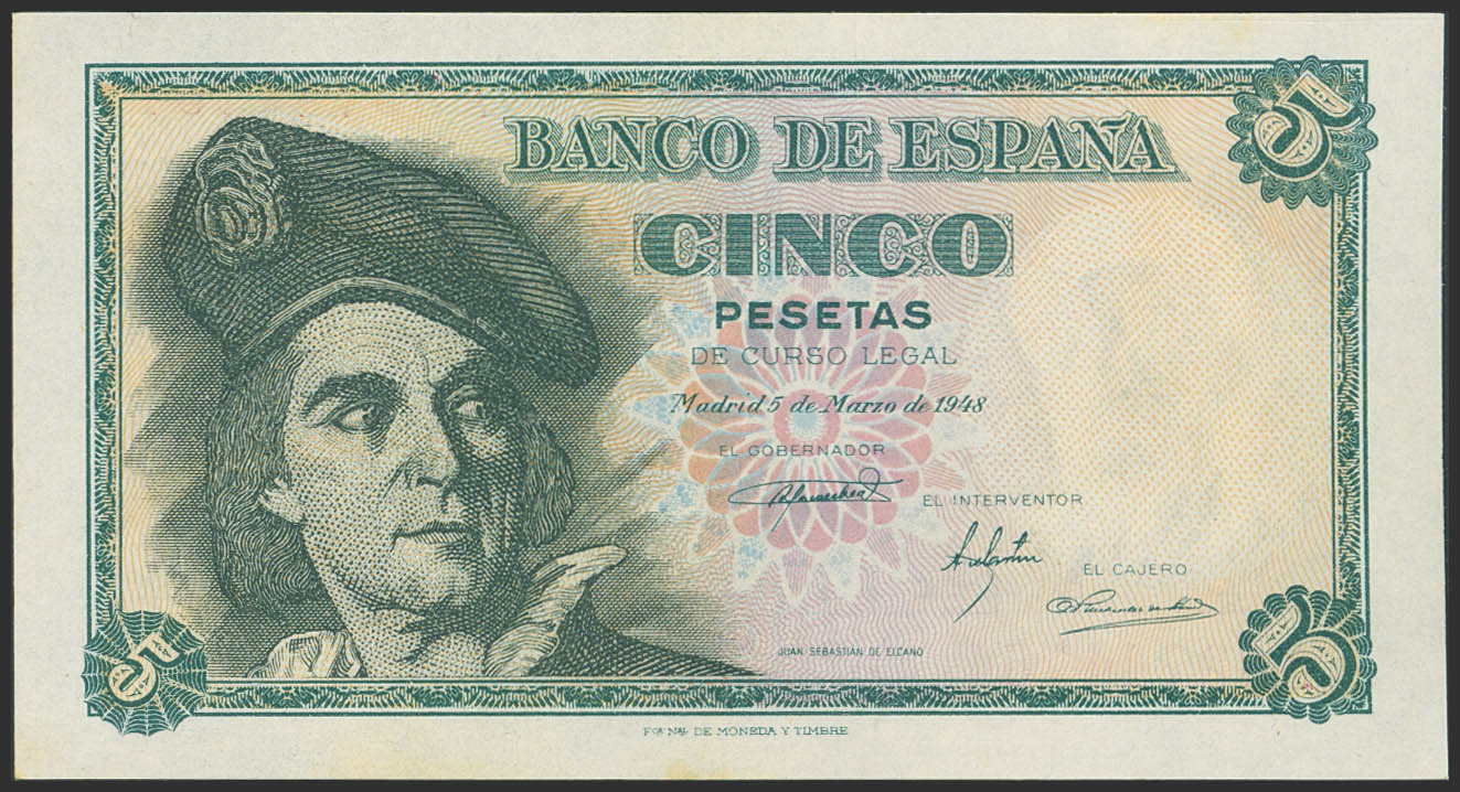 5 Pesetas. 5 de Marzo de 1948. Serie A. (Edifil 2023: 455a). Apresto original, tonalizado. SC-.