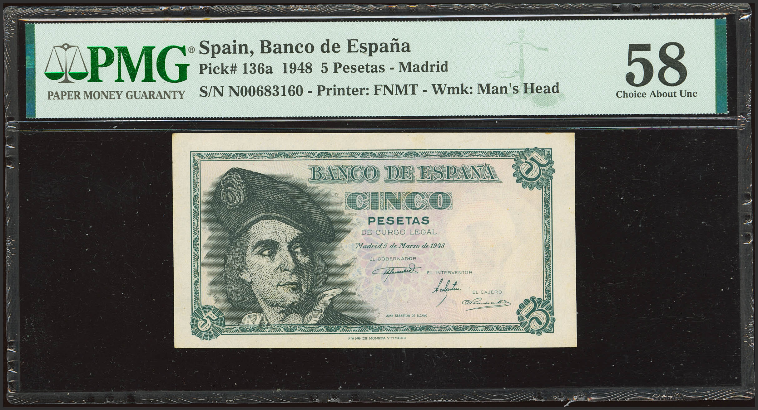 5 Pesetas. 5 de Marzo de 1948. Serie N, última serie emitida. (Edifil 2023: 455b, Pick: 136a). Muy raro. EBC++. Encapsulado PMG58.