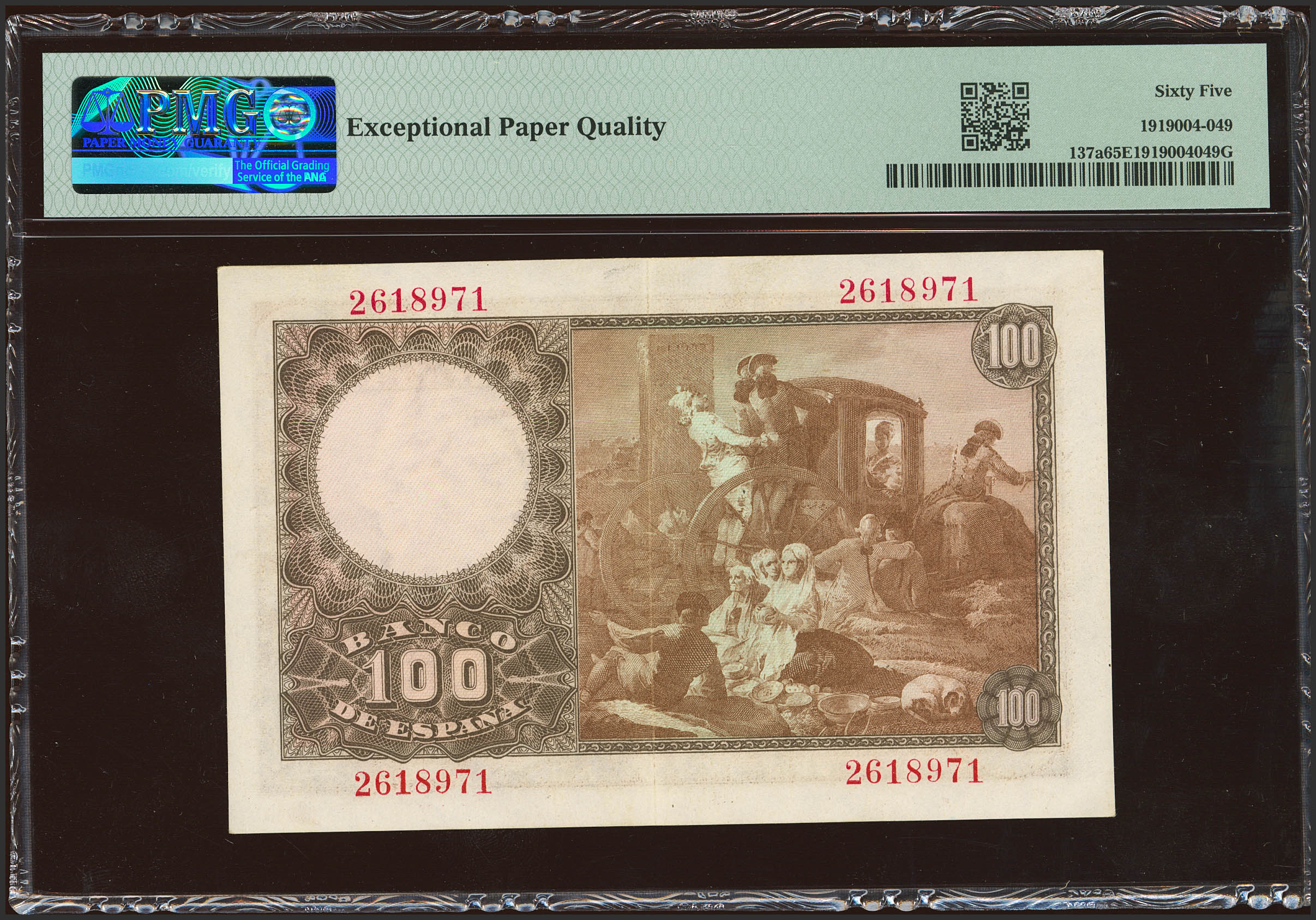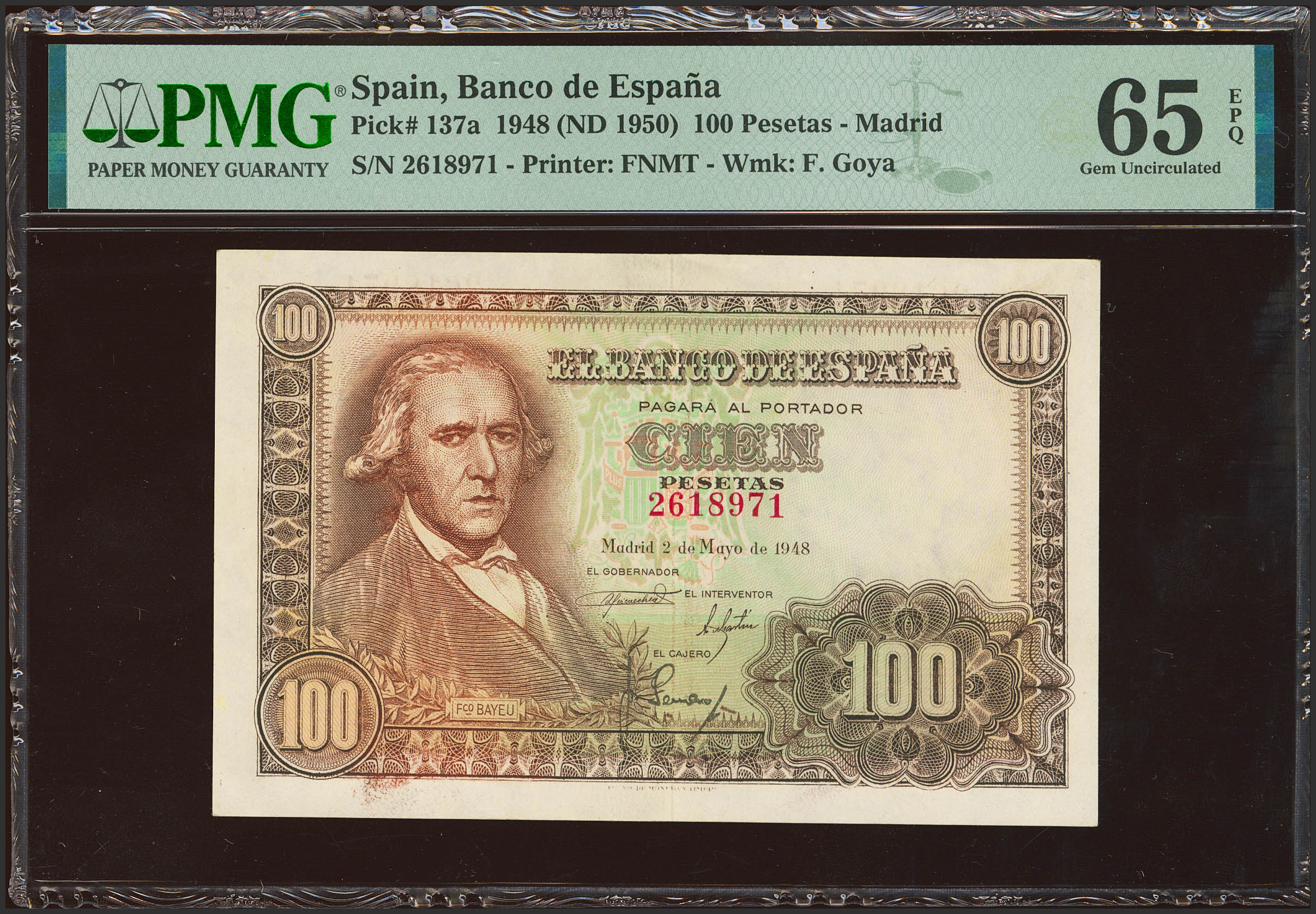 100 Pesetas. 2 de Mayo de 1948. Sin serie. (Edifil 2023: 456, Pick: 137a). Inusual en esta excepcional calidad, apresto original. SC. Encapsulado PMG65EPQ.