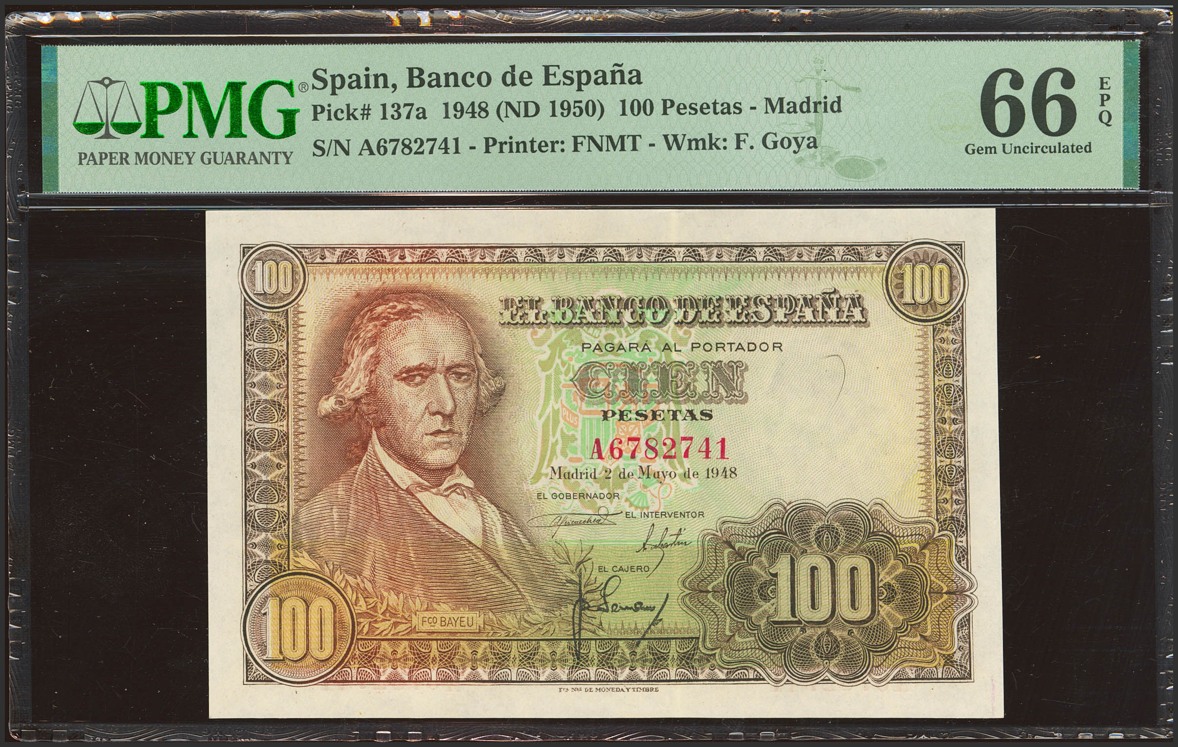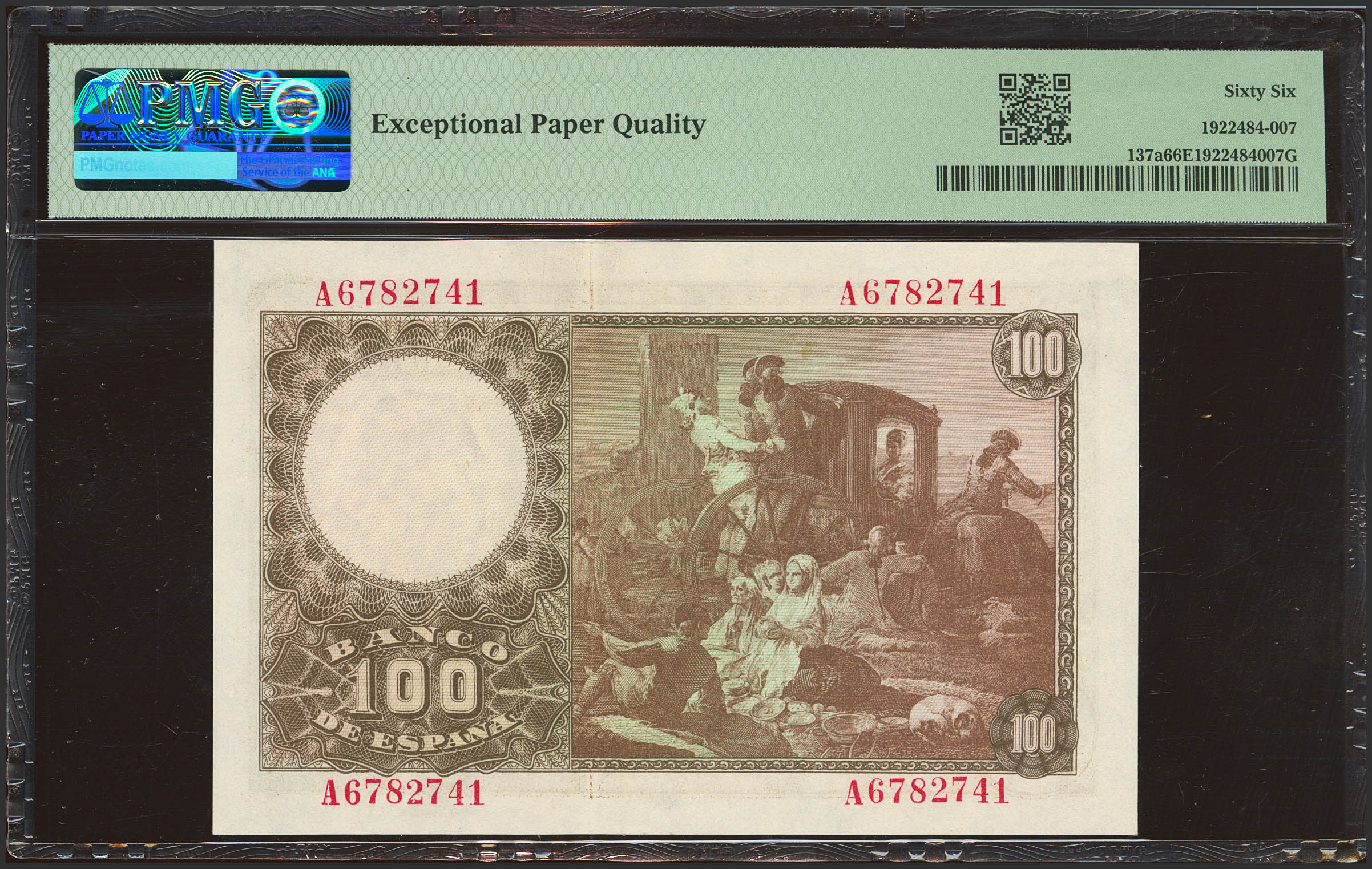 100 Pesetas. 2 de Mayo de 1948. Serie A. (Edifil 2023: 456a, Pick: 137a). Raro en esta excepcional calidad, apresto original. SC. Encapsulado PMG66EPQ.