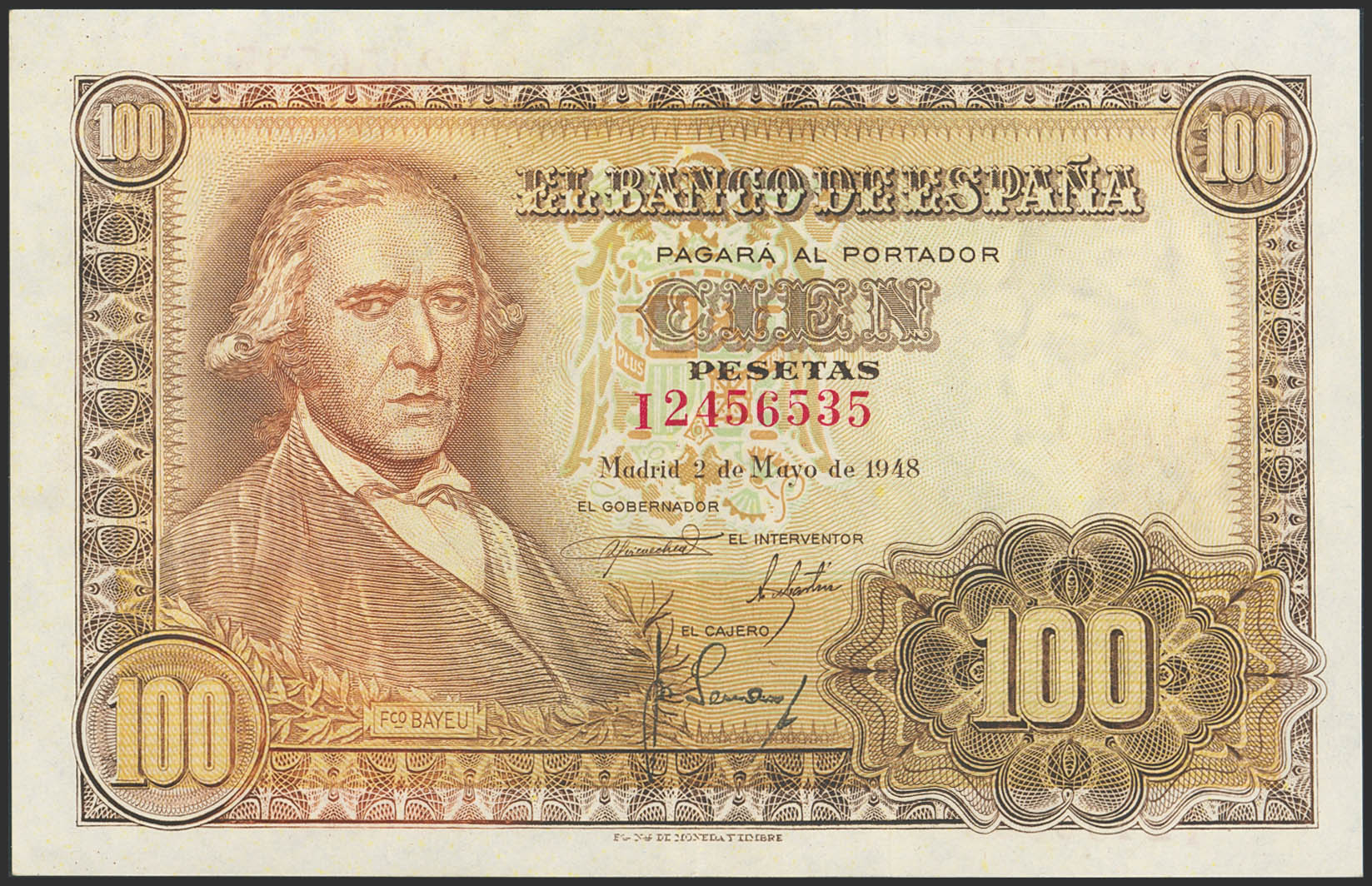 100 Pesetas. 2 de Mayo de 1948. Serie I, última serie emitida. (Edifil 2023: 456b). Conserva parte de su apresto original. EBC+.