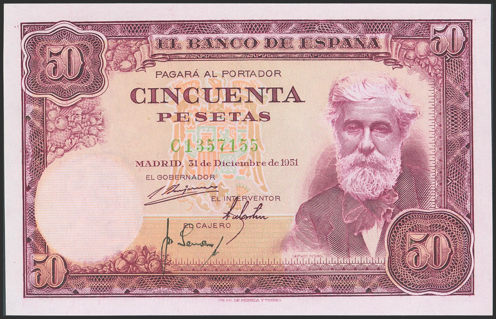 50 Pesetas. 31 de Diciembre de 1951. Serie C. (Edifil 2023: 462a). Apresto original. SC.