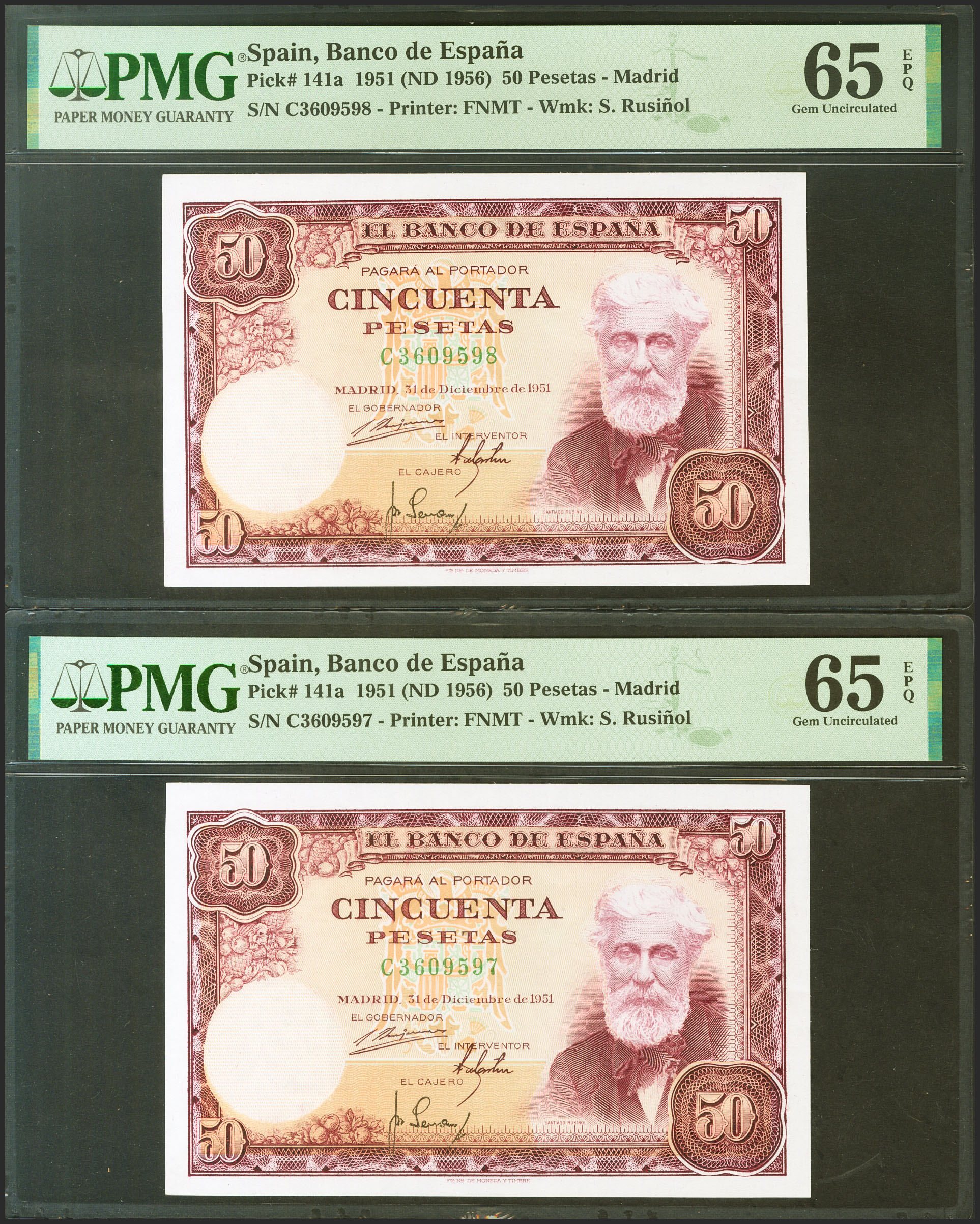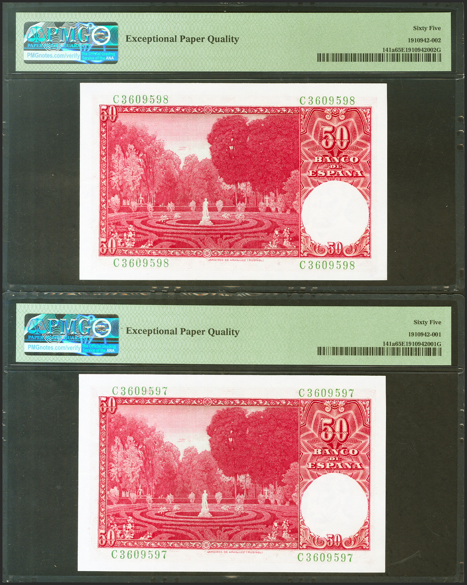 50 Pesetas. 31 de Diciembre de 1951. Pareja correlativa. Serie C. (EDifil 2021: 462a). Inusual en esta calidad, conservando todo su apresto original. SC. Encapsulados PMG65EPQ, ambos.