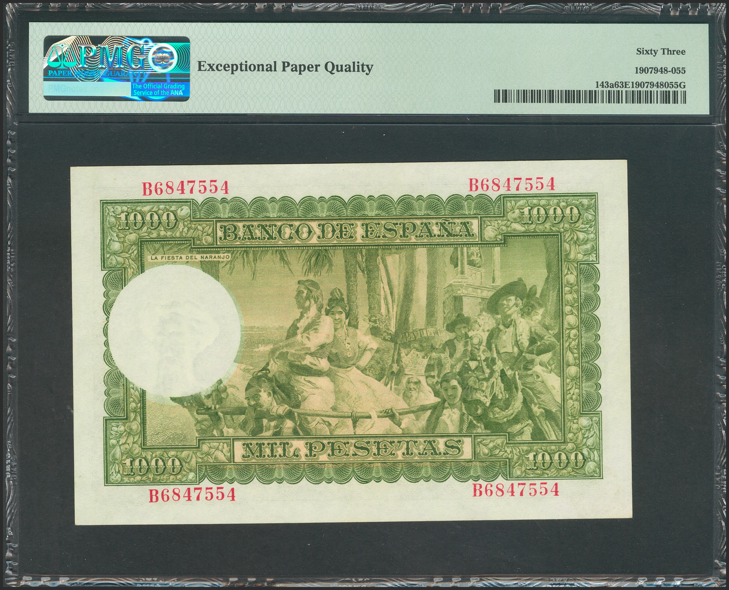1000 Pesetas. 31 de Diciembre de 1951. Serie B. (Edifil 2017: 463a). Inusual en esta excepcional calidad conservando todo su apresto original. SC. Encapsulado PMG63EPQ.