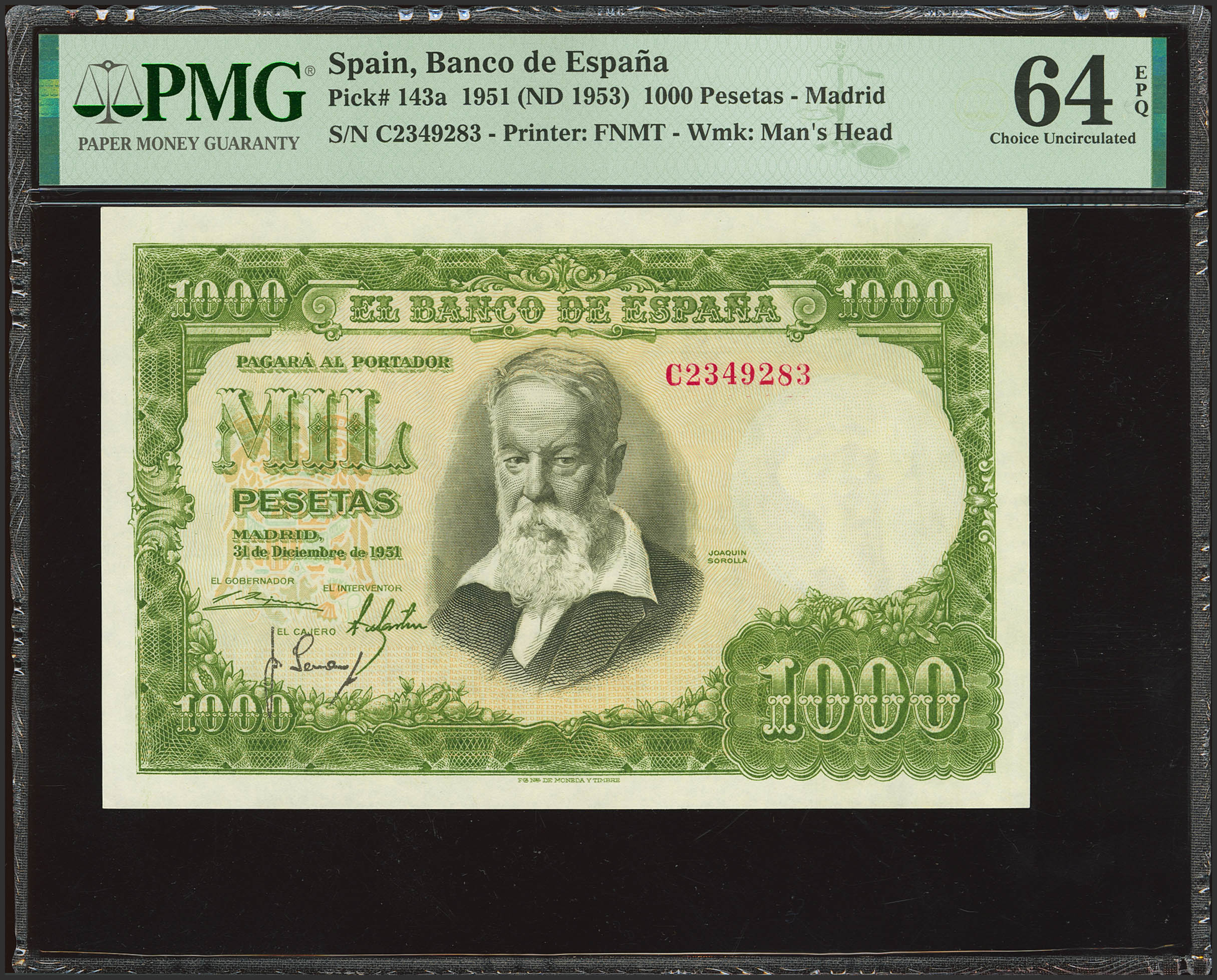 1000 Pesetas. 31 de Diciembre de 1951. Serie C. (Edifil 2021: 463a, Pick: 143a). Apresto original. SC. Encapsulado PMG64EPQ.