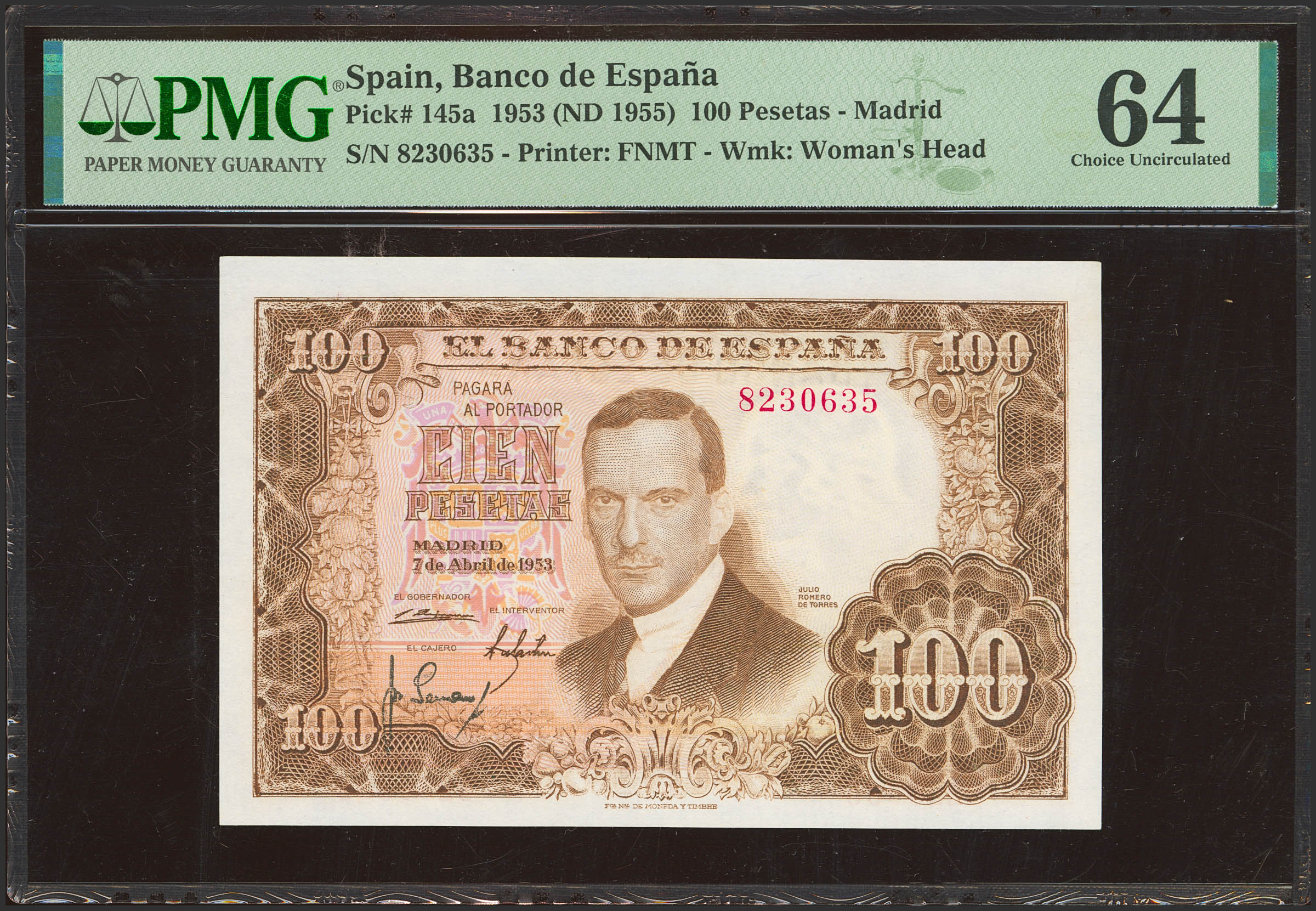 100 Pesetas. 7 de Abril de 1953. Sin serie. (Edifil 2023: 464, Pick: 145a). Inusual en esta excepcional calidad. SC. Encapsulado PMG64.
